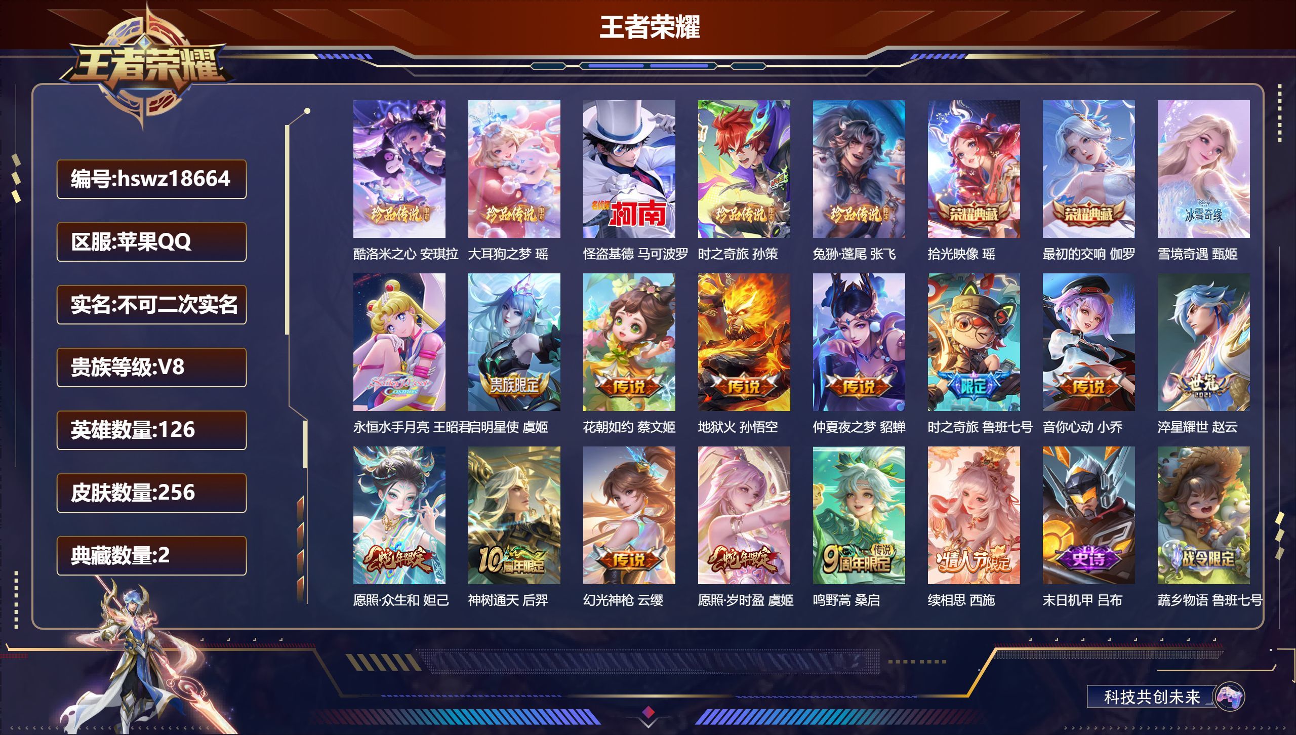 苹果QQ/最强王者/256皮肤/126英雄/2典藏/1珍品无双/1无双/5珍品传说/14传说/75史