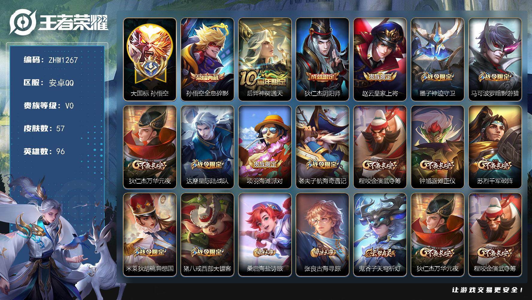 可二次大国标猴子【店主推荐捡漏号!可直接换绑】安卓Q-V0-最强王者段位-96英雄-57皮肤-1典藏-1传说-18史诗