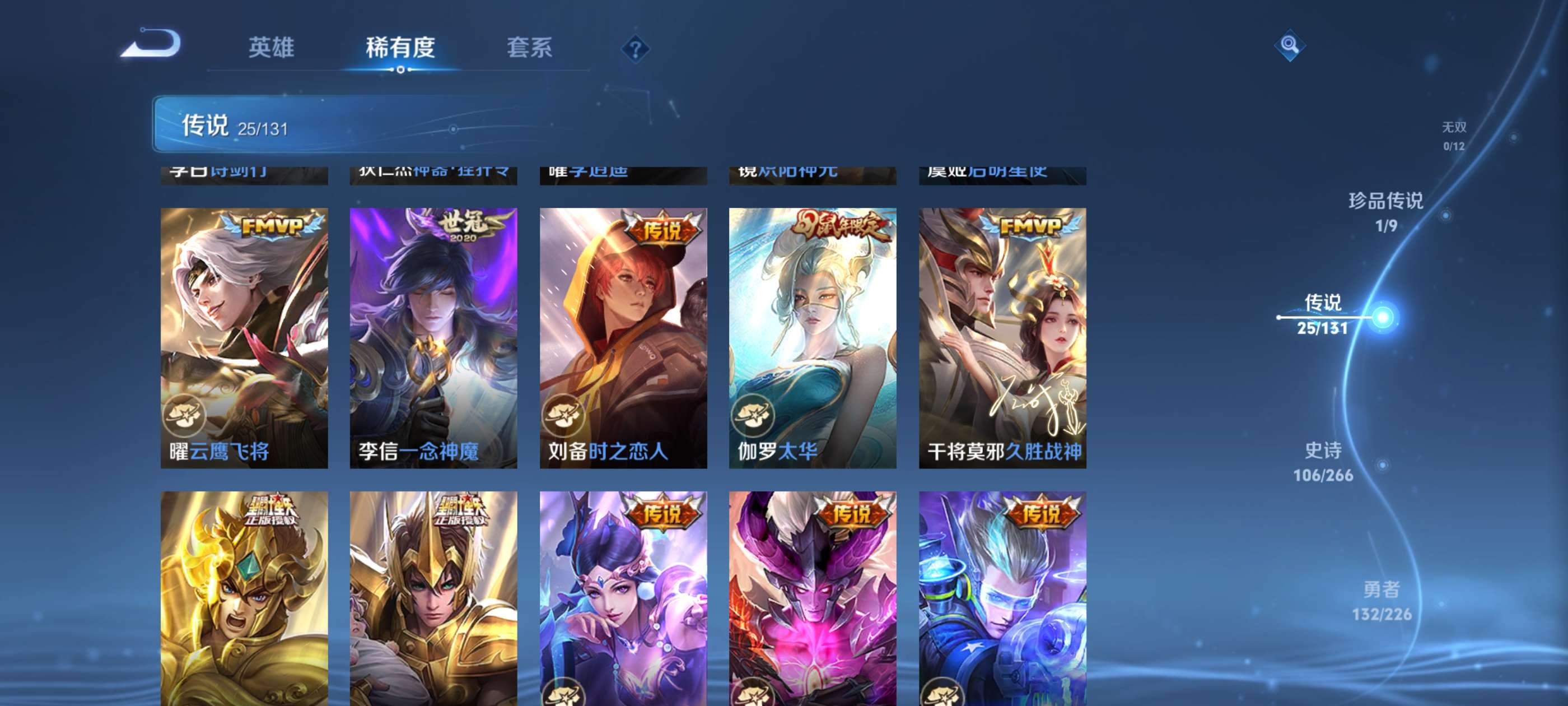 320皮肤/125英雄/3典藏/1无双/1珍品传说/24传说/96史诗/9稀有英雄