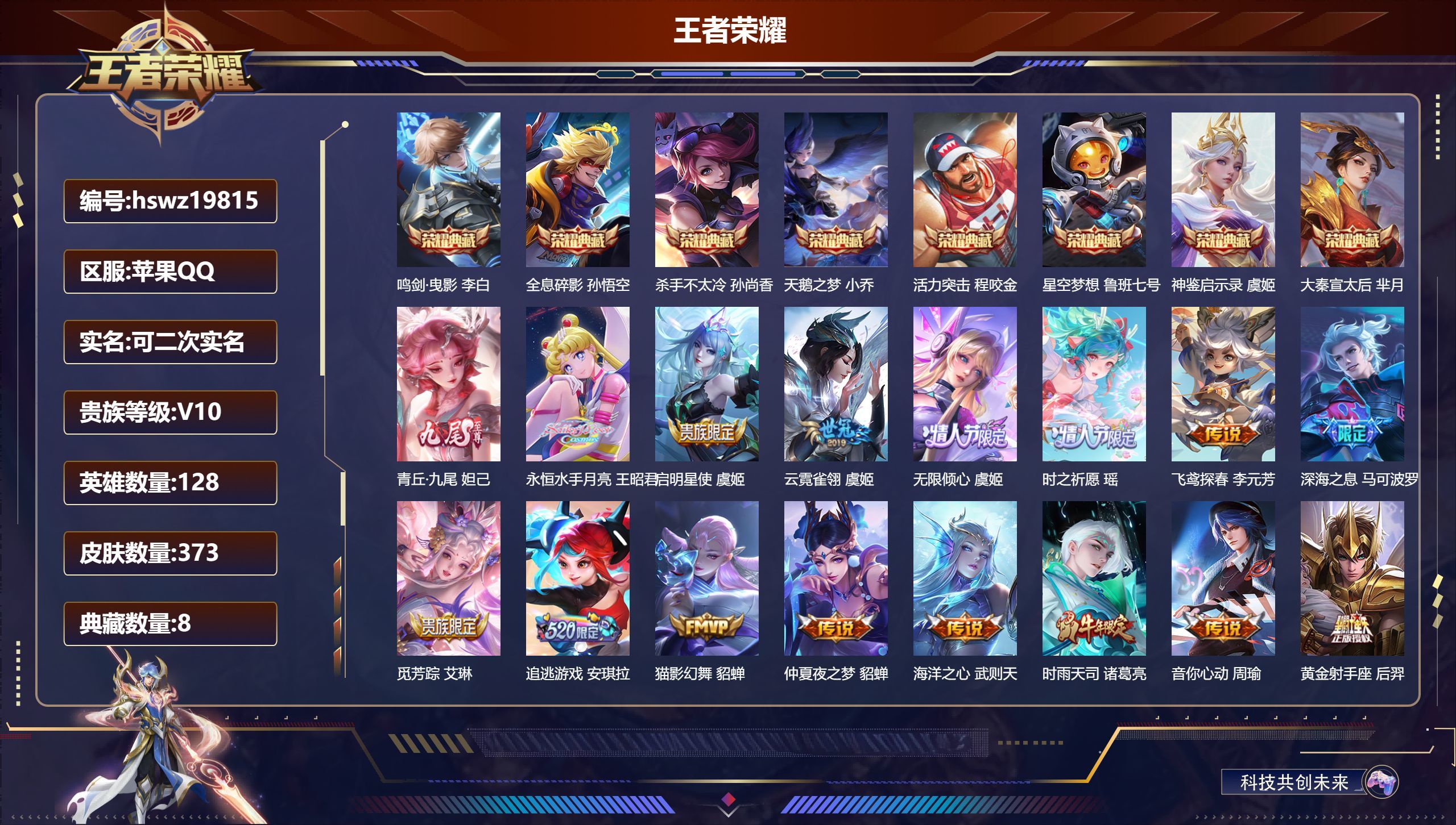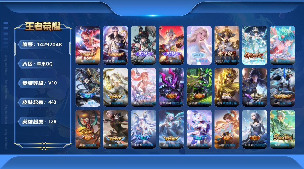 苹果QQ/无双王者/373皮肤/128英雄/8典藏/0珍品无双/1无双/0珍品传说/33传说/111