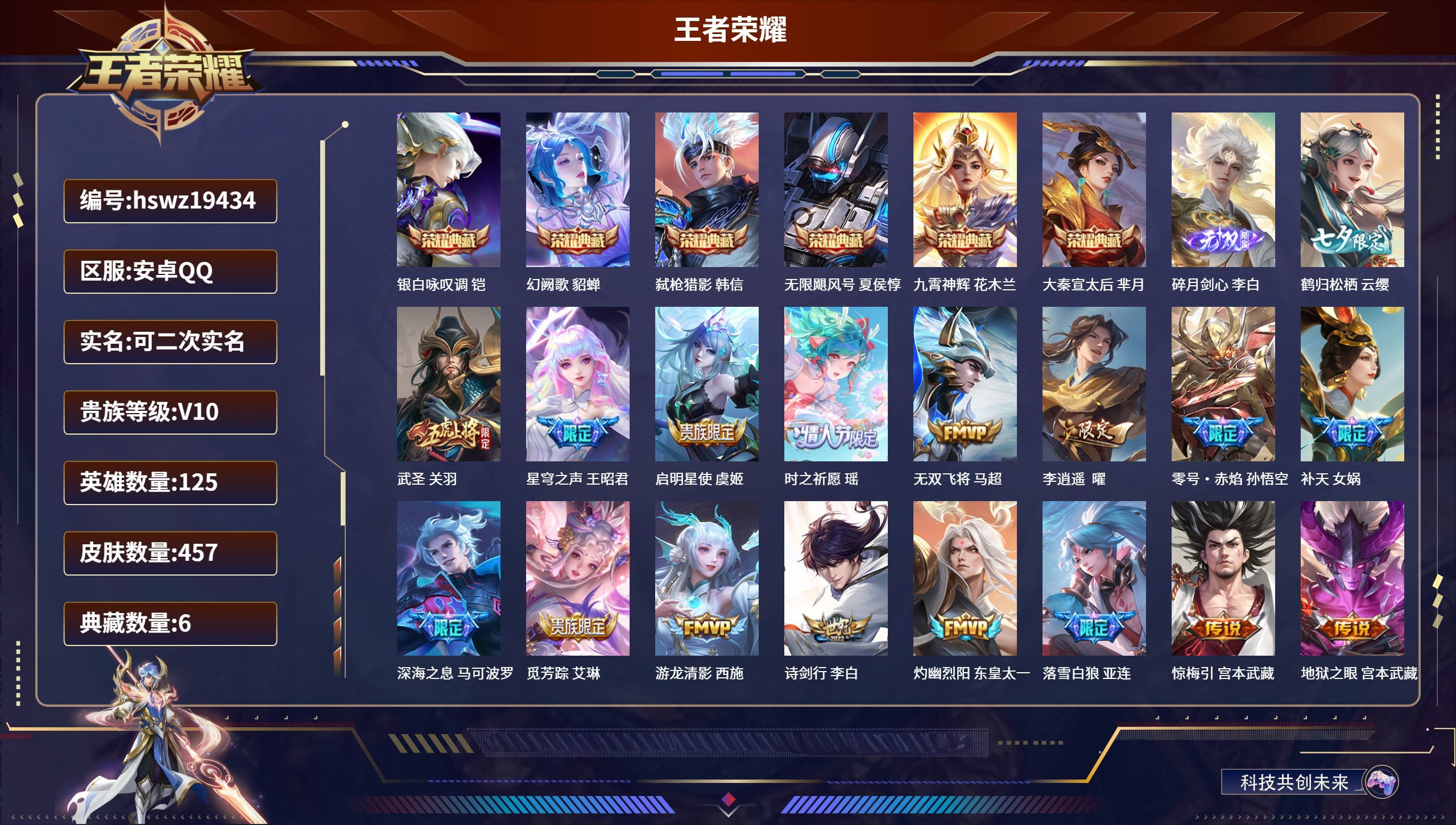 安卓微信-2典藏-2传说-200皮肤-125英雄-至尊星耀-李白 程咬金典藏 猴子至尊宝青龙朱雀等超多稀有限定 外加99级幻神穿越火线号