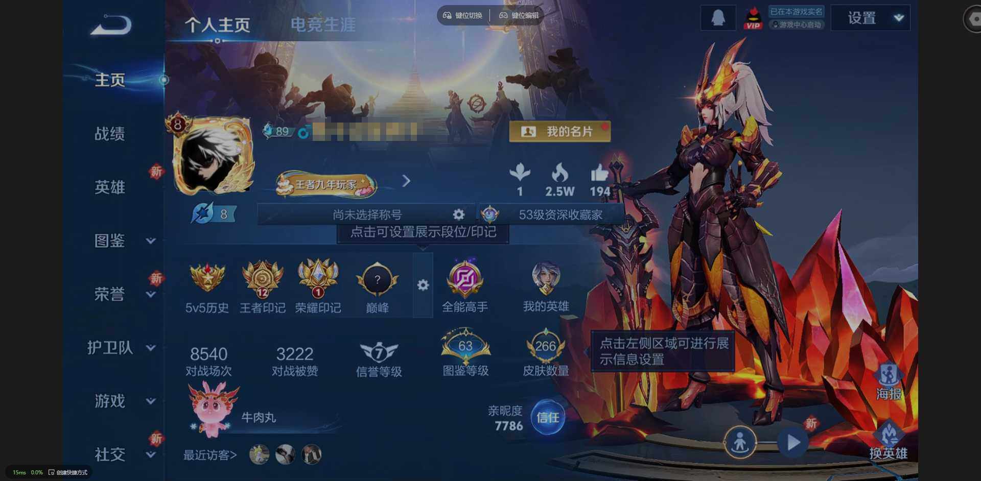 实名: 可修改 贵族等级: V8 英雄数: 127 皮肤数: 266 荣耀水晶