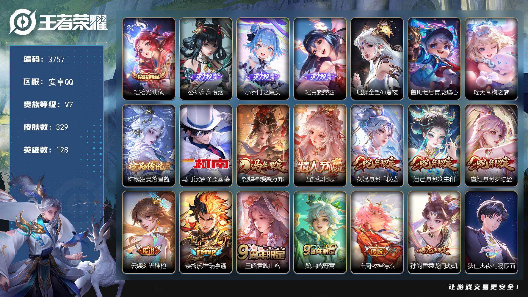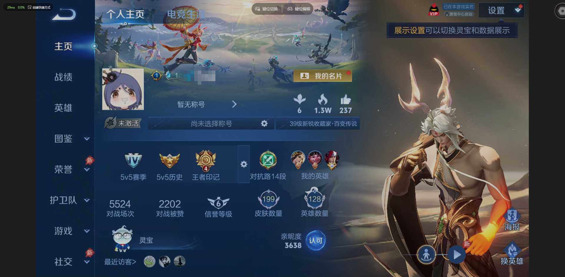 实名: 可修改 贵族等级: V8 英雄数: 128 皮肤数: 199 荣耀水晶