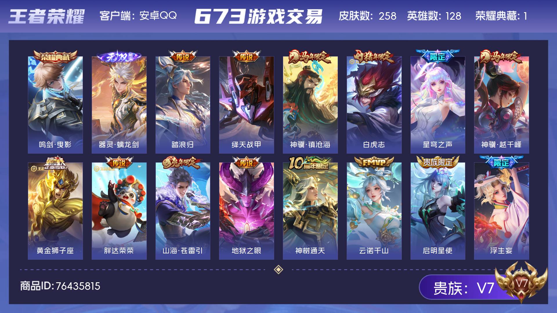 V7 皮肤258 英雄128 永恒钻石 荣耀典藏1 无双皮肤1 星传说1 传说32
