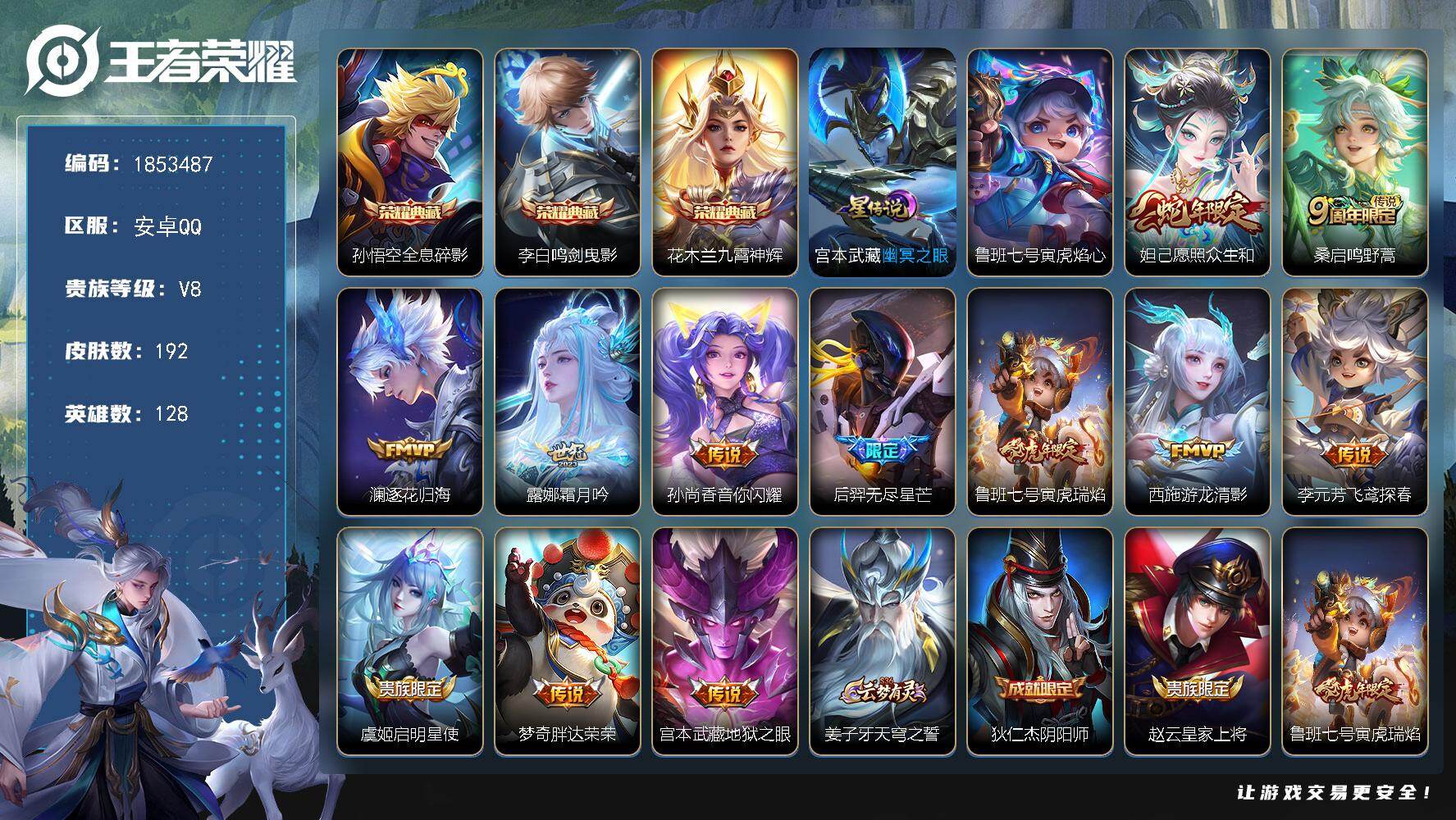 V8-尊贵铂金II段位-128英雄-192皮肤-3典藏皮肤-12传说-51史诗
