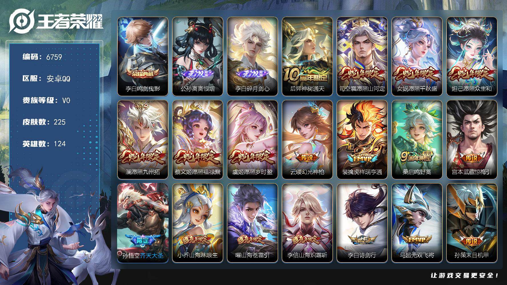贵族0/皮肤225/典藏1/传说25/史诗59/英雄124/孙权全皮/司空震全皮
