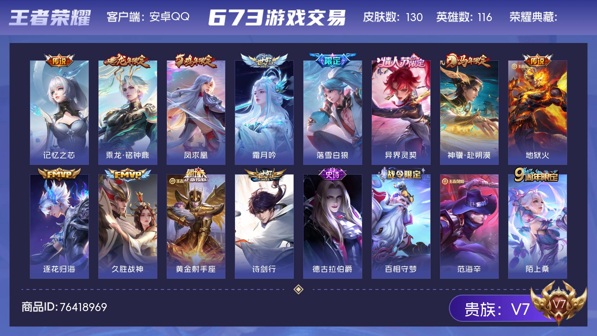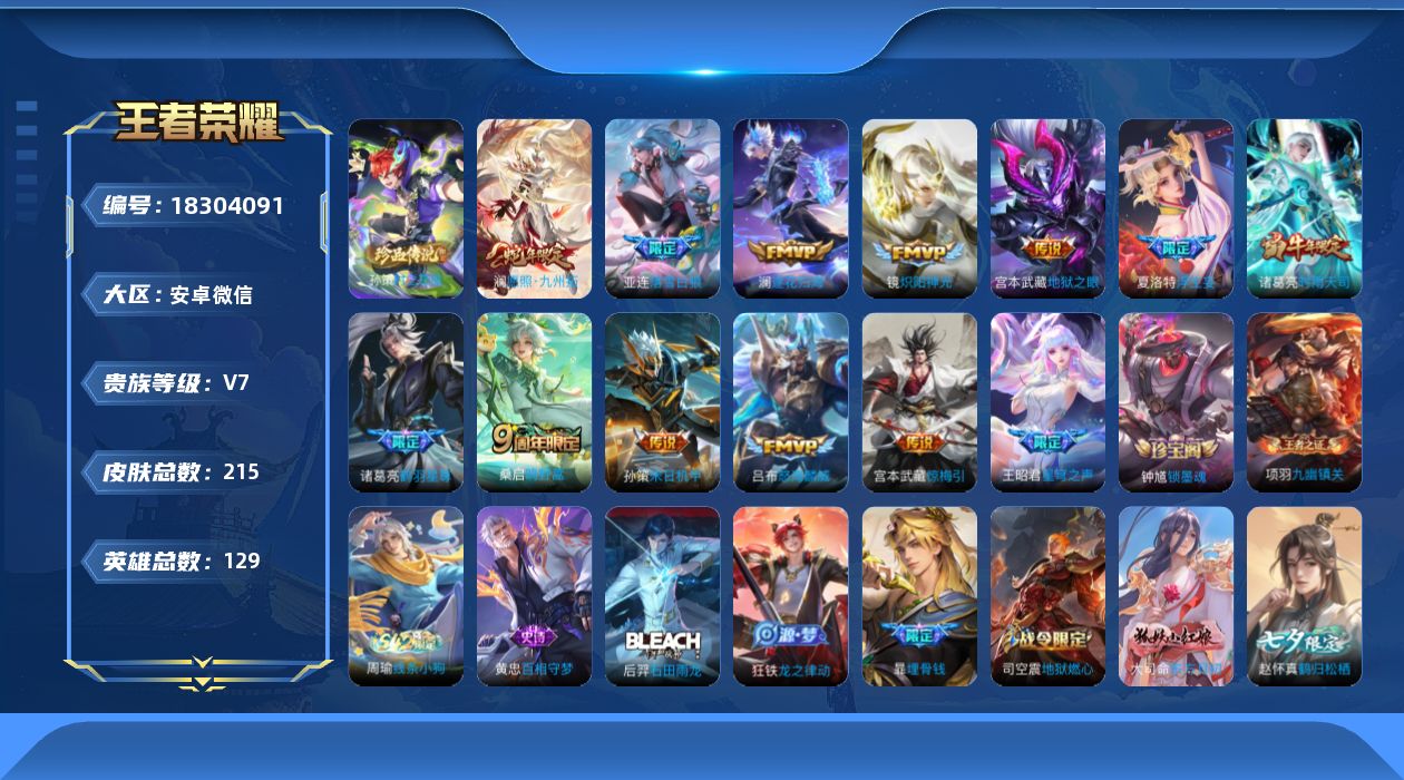 安卓QQ/绝世王者/231皮肤/128英雄/1典藏/0珍品无双/2无双/0珍品传