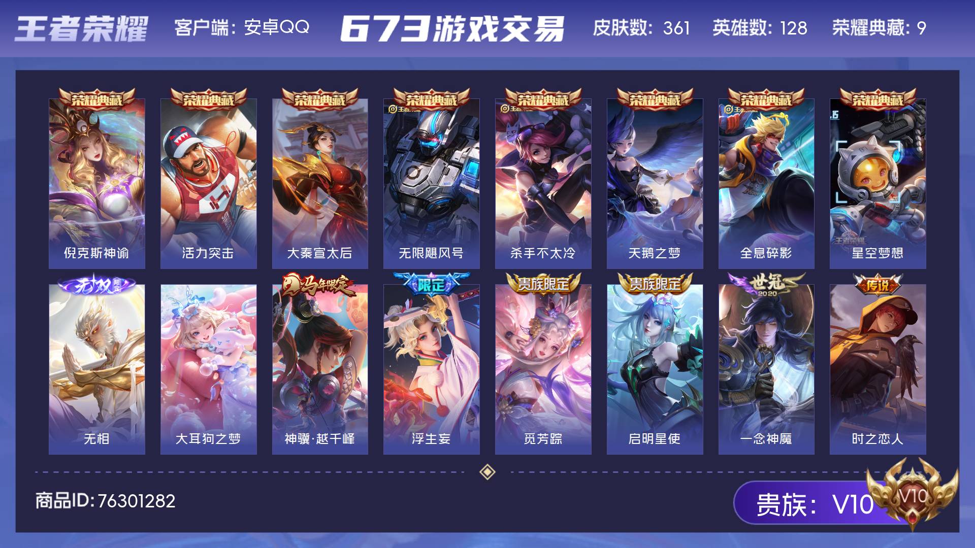 V10 皮肤361 英雄128 无双王者 荣耀典藏9 无双皮肤1 珍品传说1 星传说22 传说25