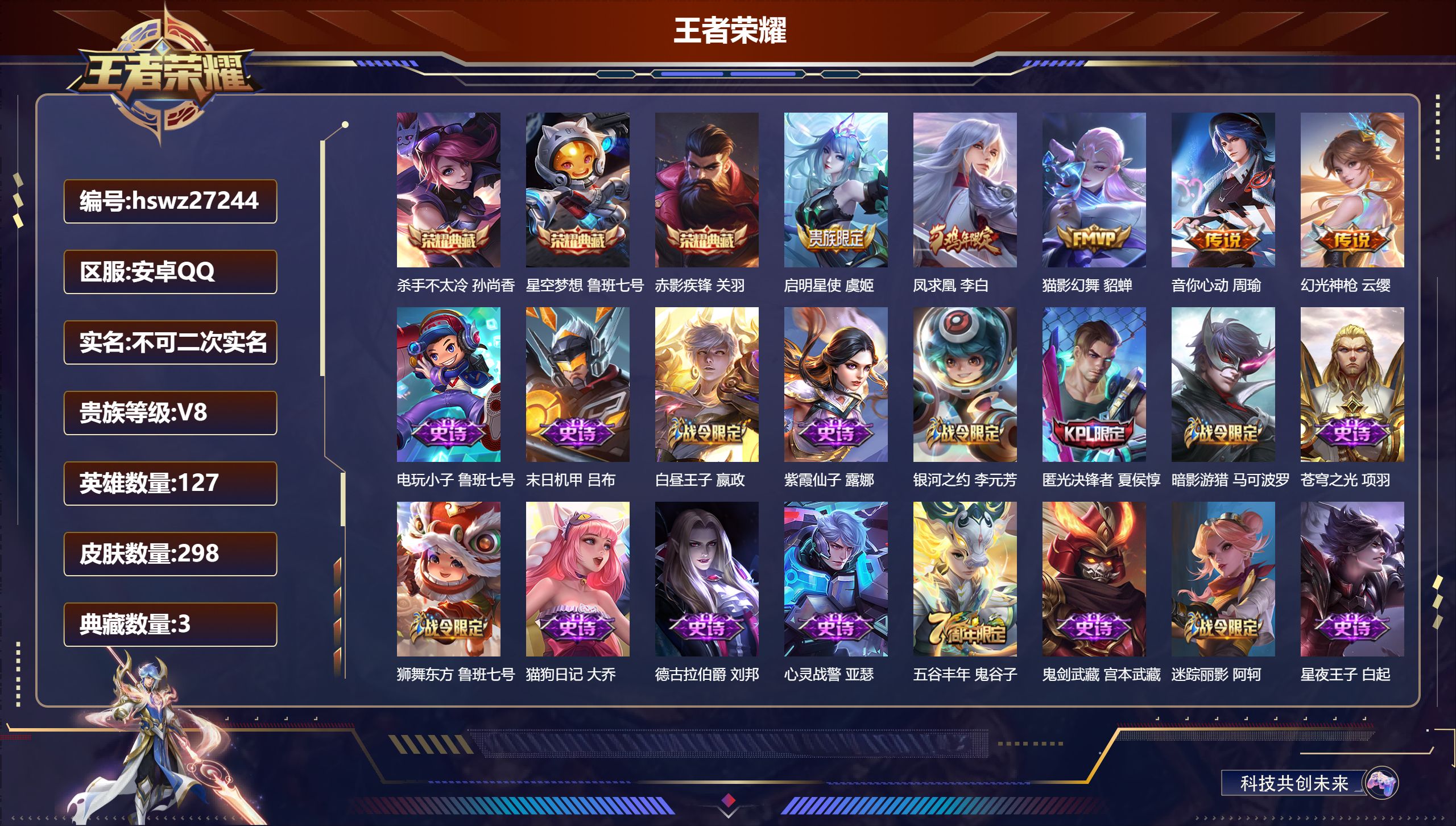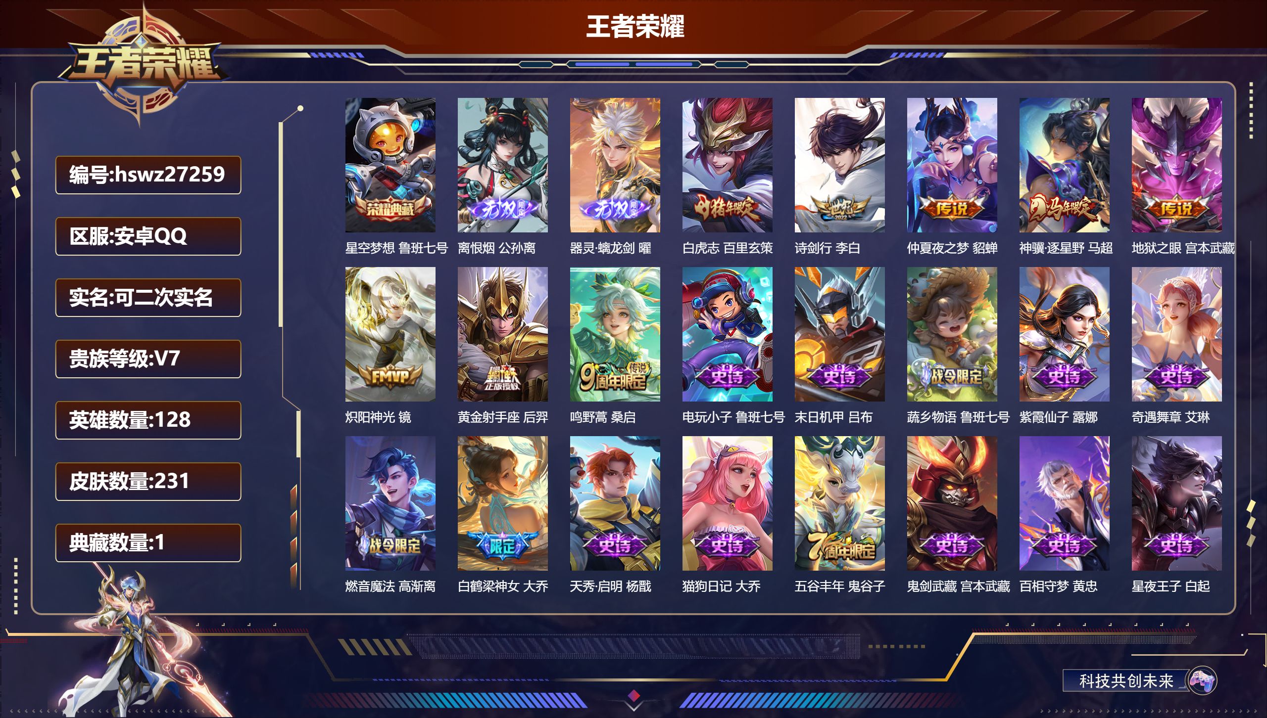 安卓QQ/绝世王者/231皮肤/128英雄/1典藏/0珍品无双/2无双/0珍品传