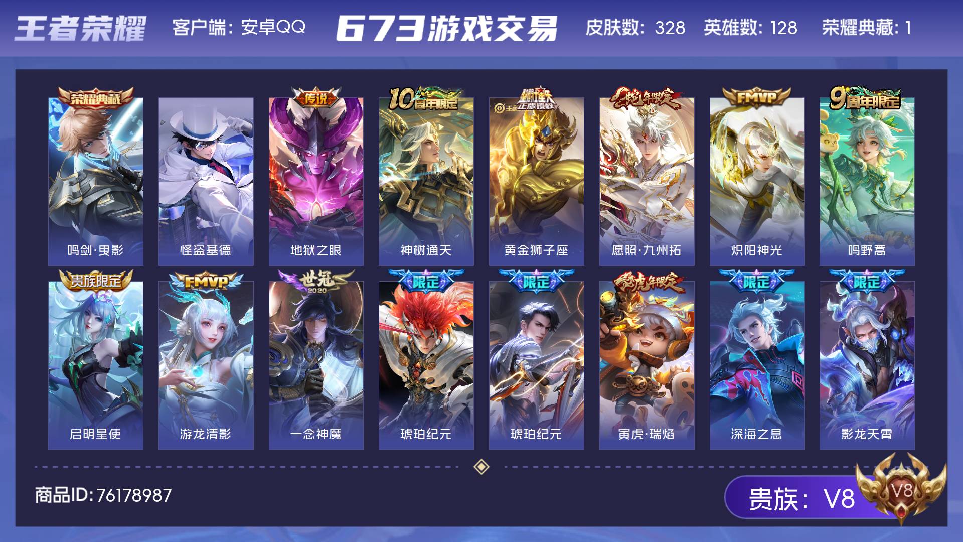 V8 皮肤328 英雄128 至圣王者 荣耀典藏1 珍品传说1 星传说2 传说17