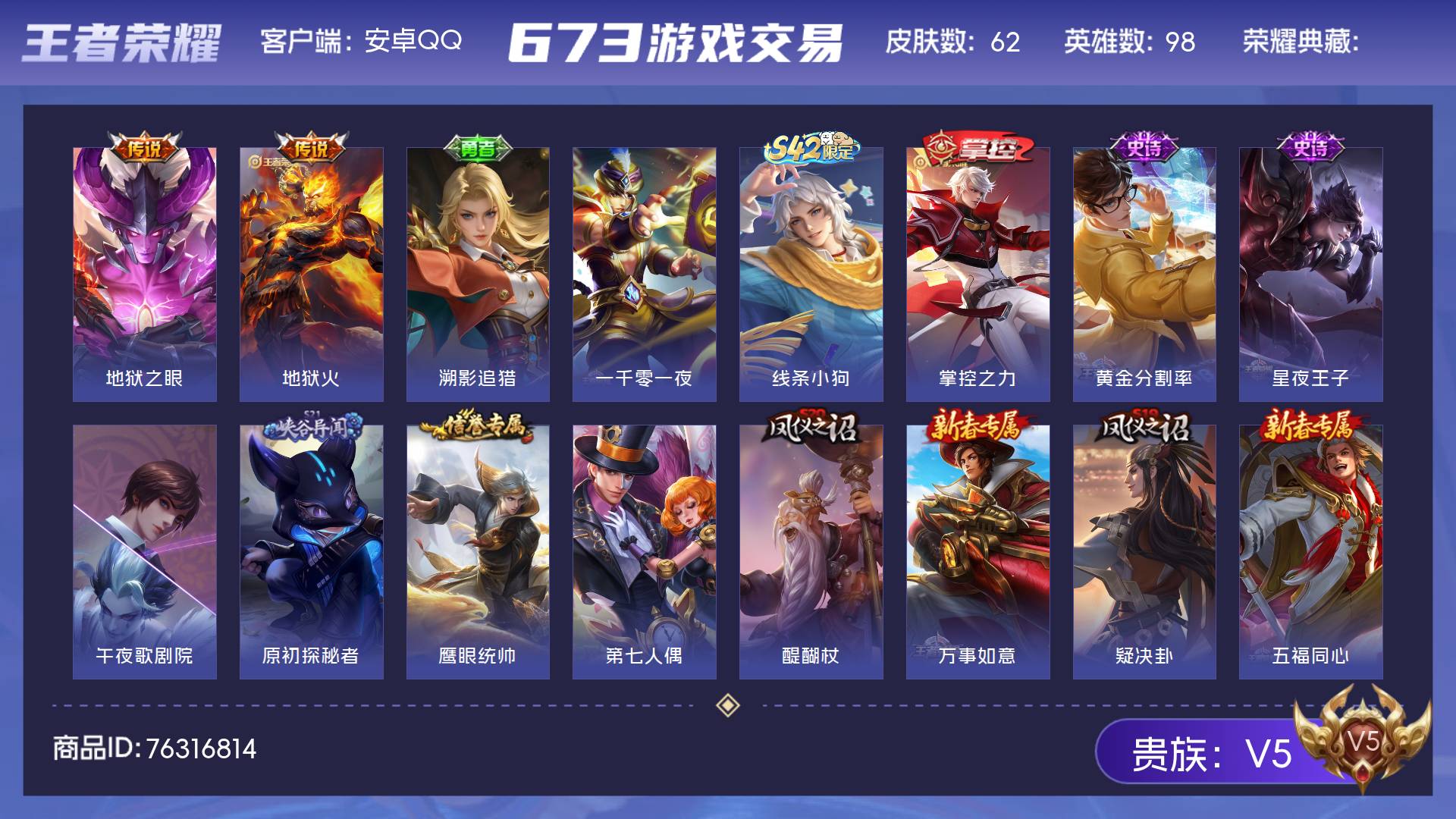 V5 皮肤62 英雄98 尊贵铂金 传说2