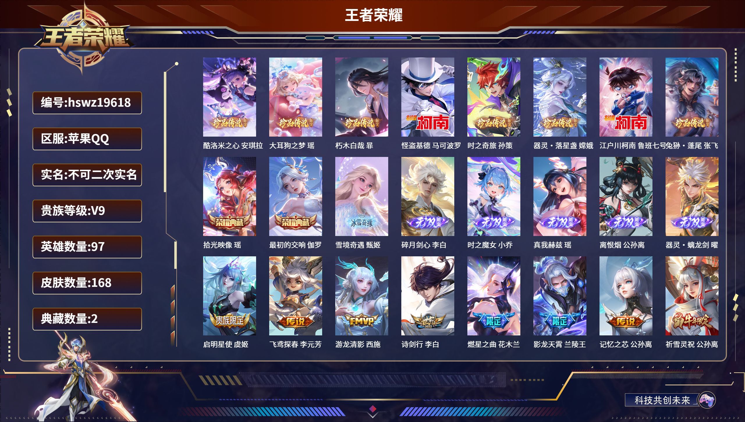 苹果QQ/非凡王者/168皮肤/97英雄/2典藏/1珍品无双/6无双/8珍品传说/31传说/46史诗