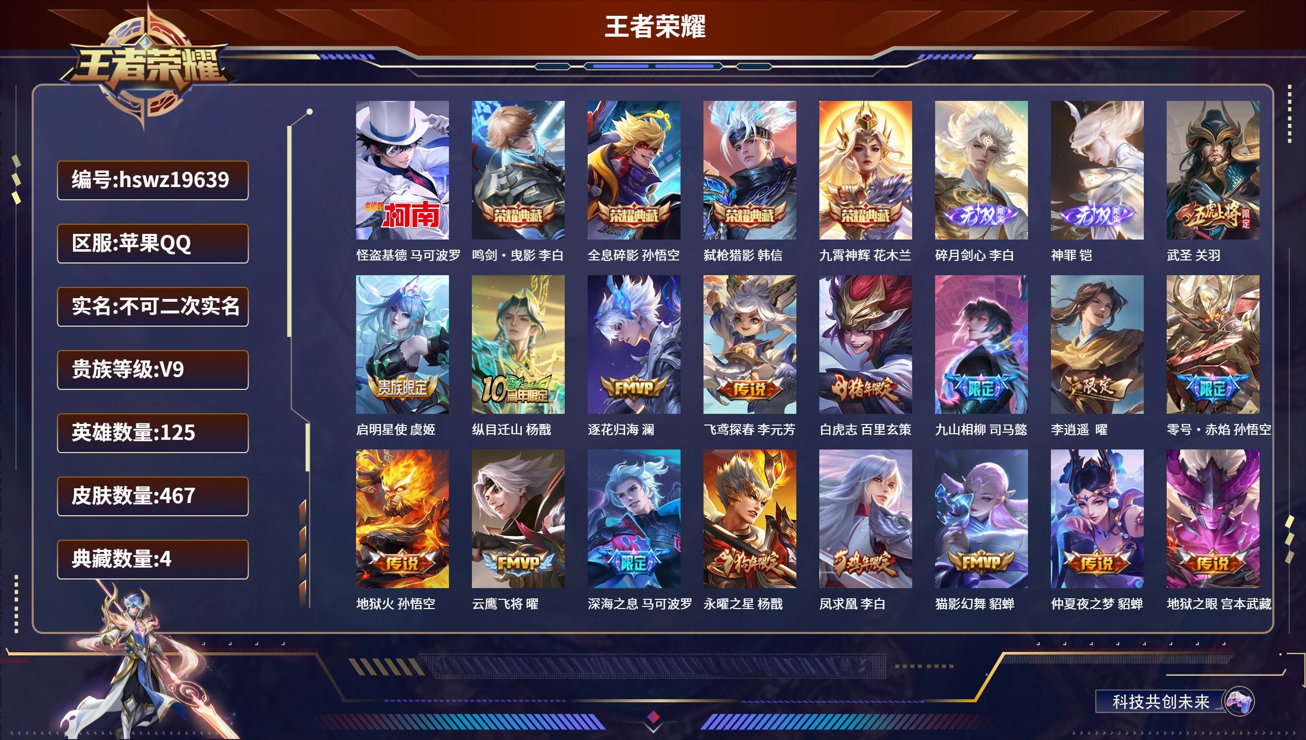 苹果QQ/无双王者/467皮肤/125英雄/4典藏/0珍品无双/2无双/1珍品传说/42传说/146