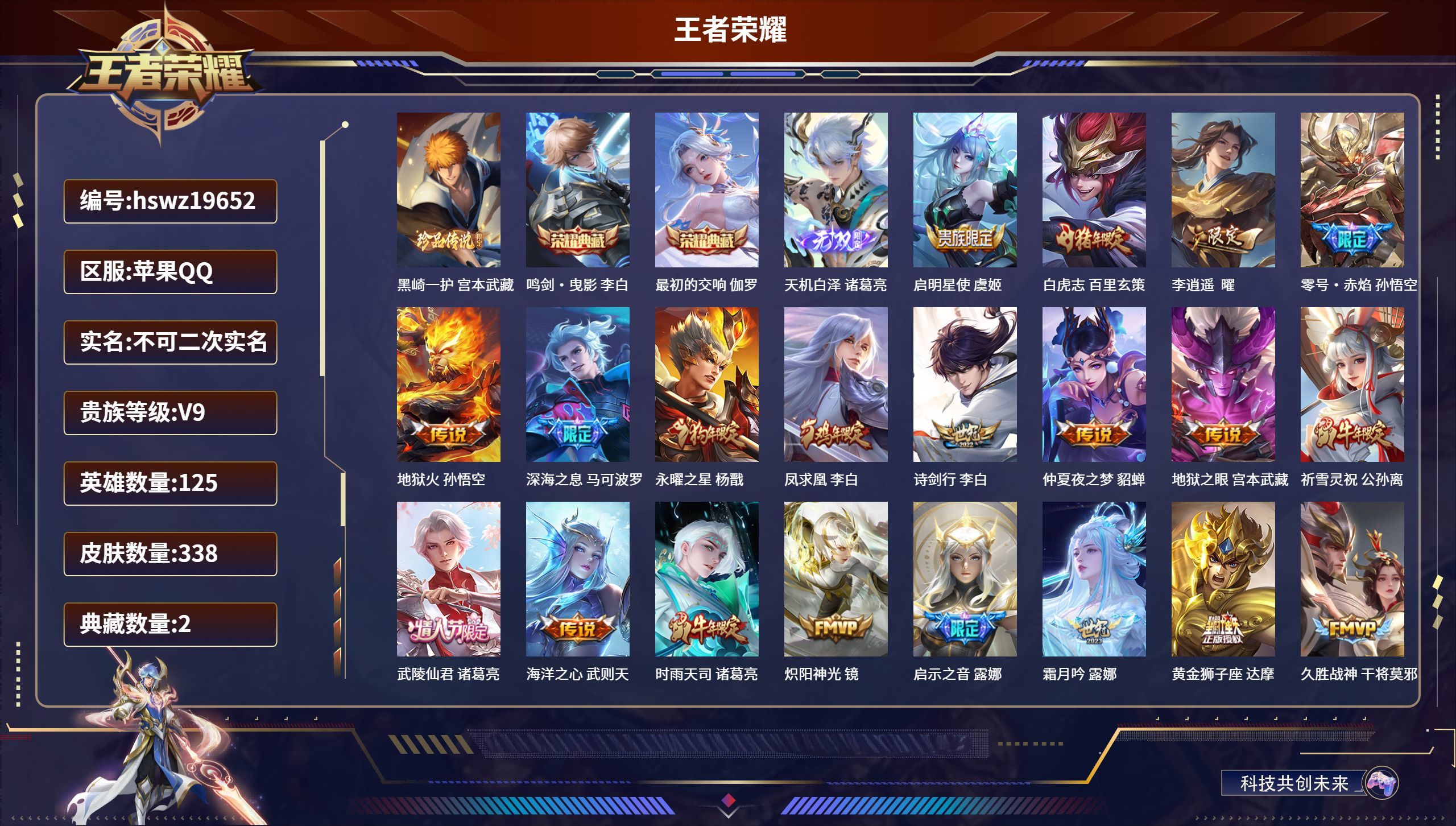 苹果QQ/非凡王者/338皮肤/125英雄/2典藏/0珍品无双/1无双/1珍品传说/27传说/97史