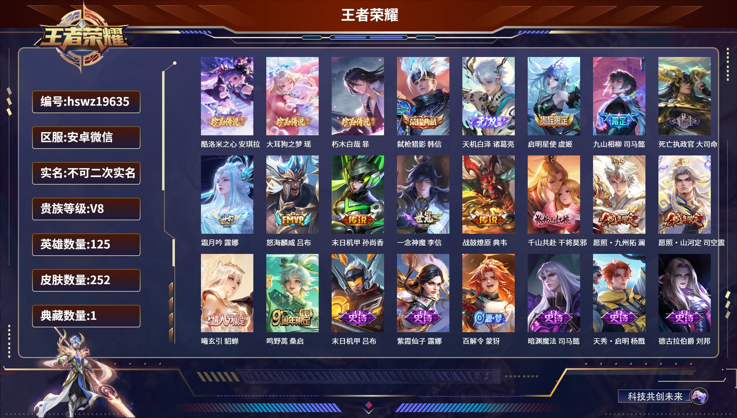 安卓v/非凡王者/252皮肤/125英雄/1典藏/0珍品无双/1无双/3珍品传说/13传说/62史