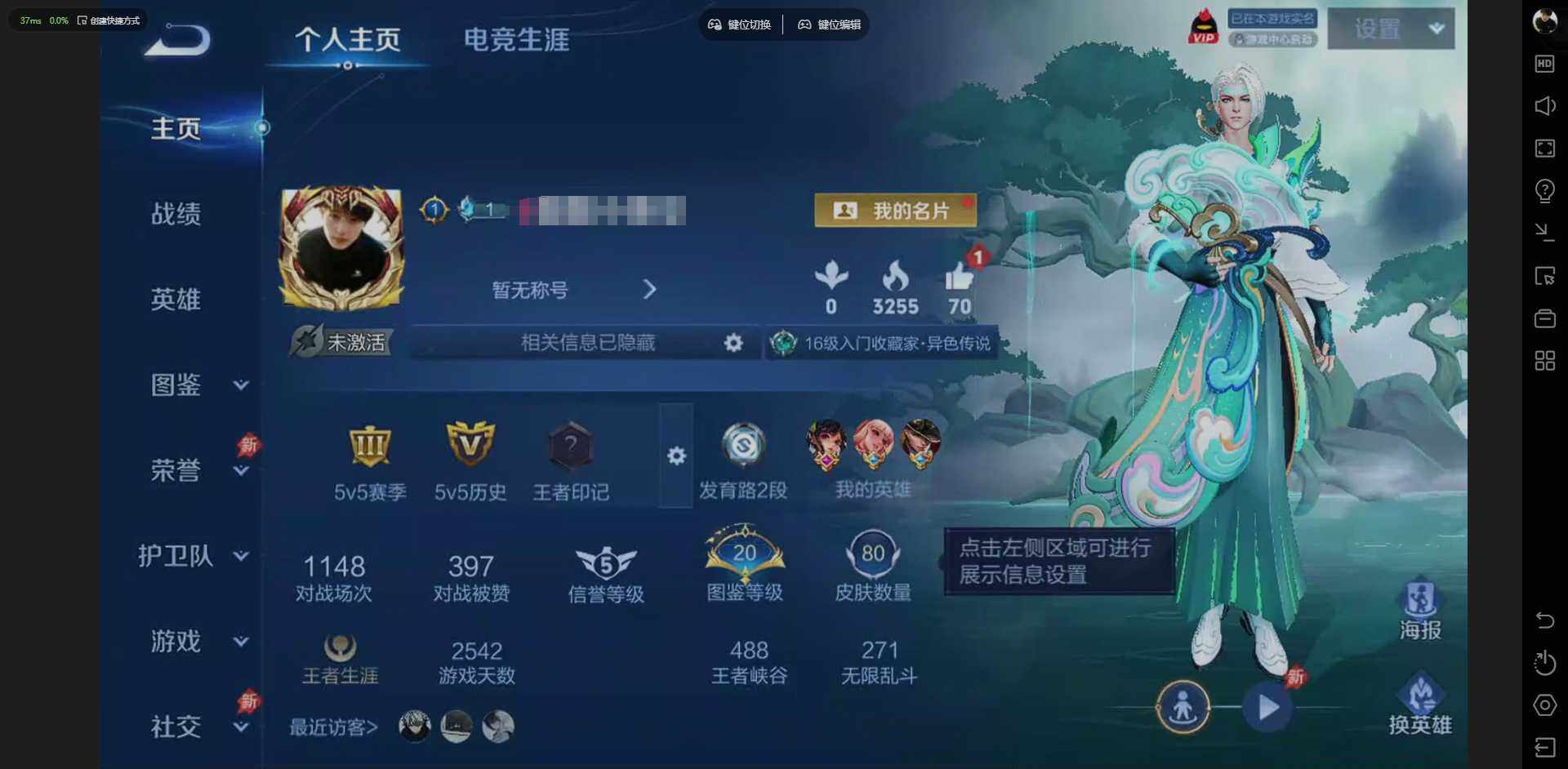实名: 可修改 贵族等级: V7 英雄数: 97 皮肤数: 80 传说皮: 末