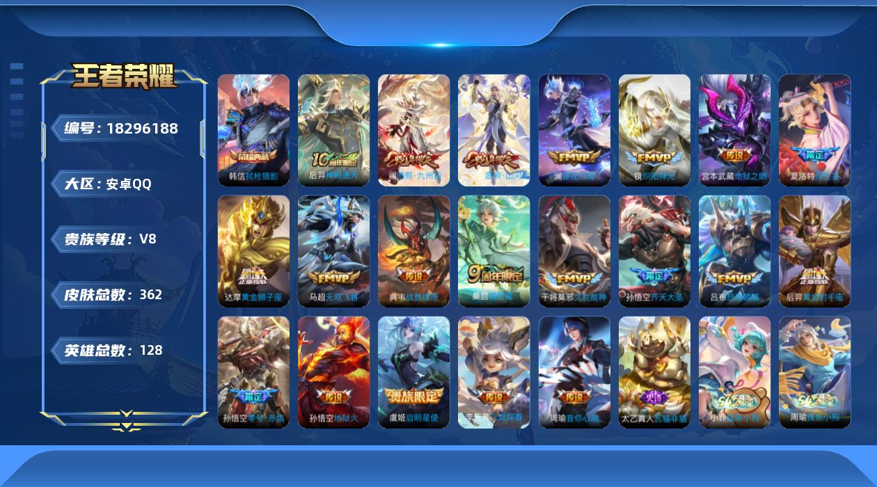 V8-最强王者段位-128英雄-362皮肤-1典藏皮肤-20传说-106史诗
