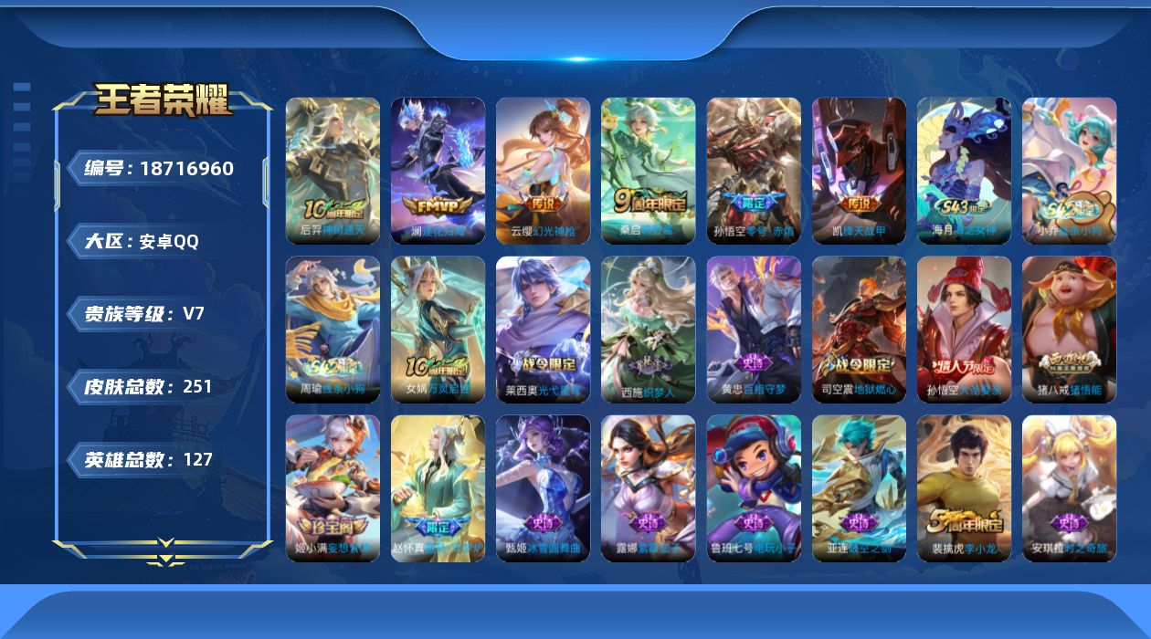 安卓Q-V7-永恒钻石IV段位-127英雄-251皮肤-6传