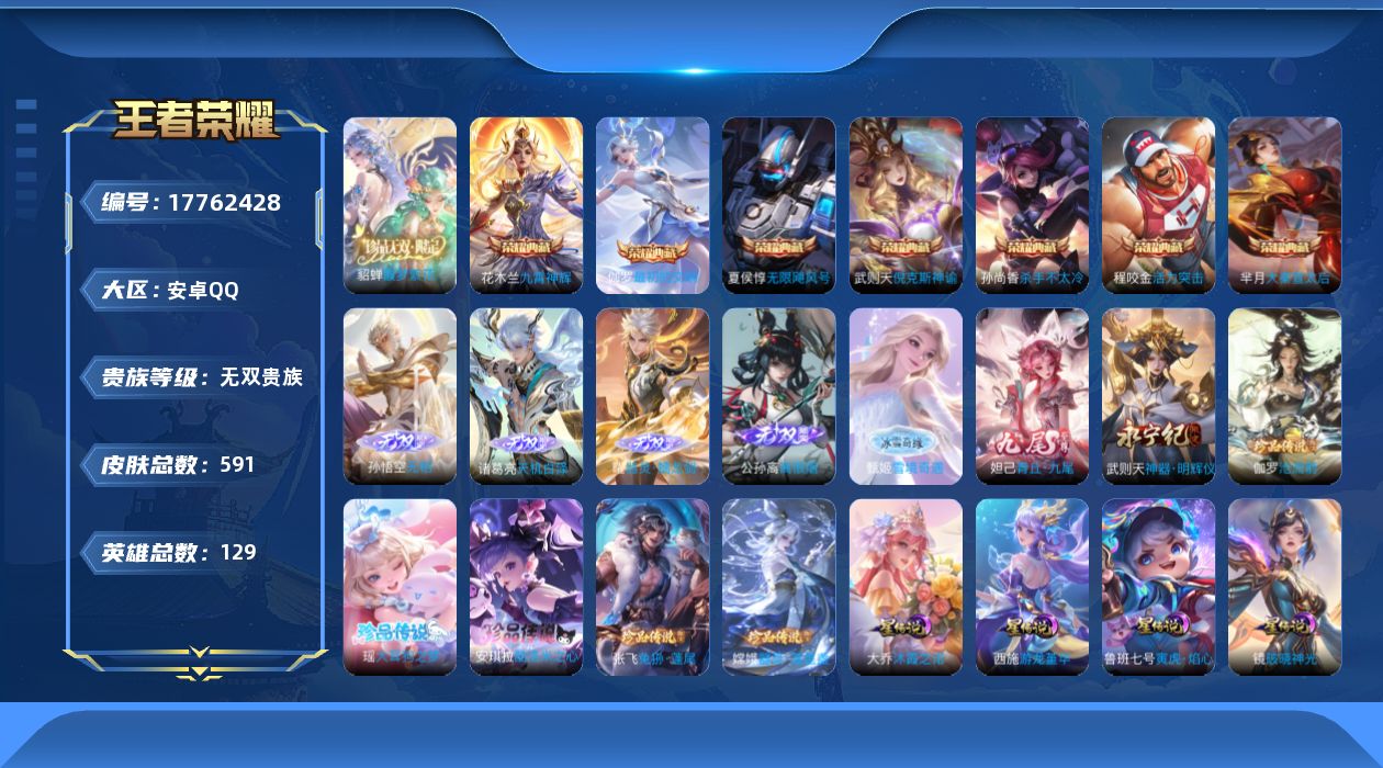 实名: 不可修改 贵族等级: 无双贵族 英雄数: 129 皮肤数: 591 荣耀