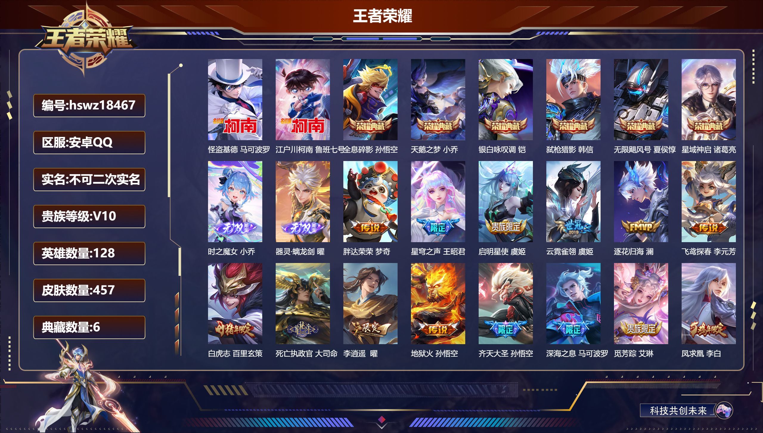 安卓QQ/荣耀王者/457皮肤/128英雄/6典藏/0珍品无双/2无双/2珍品传说/53传说/131