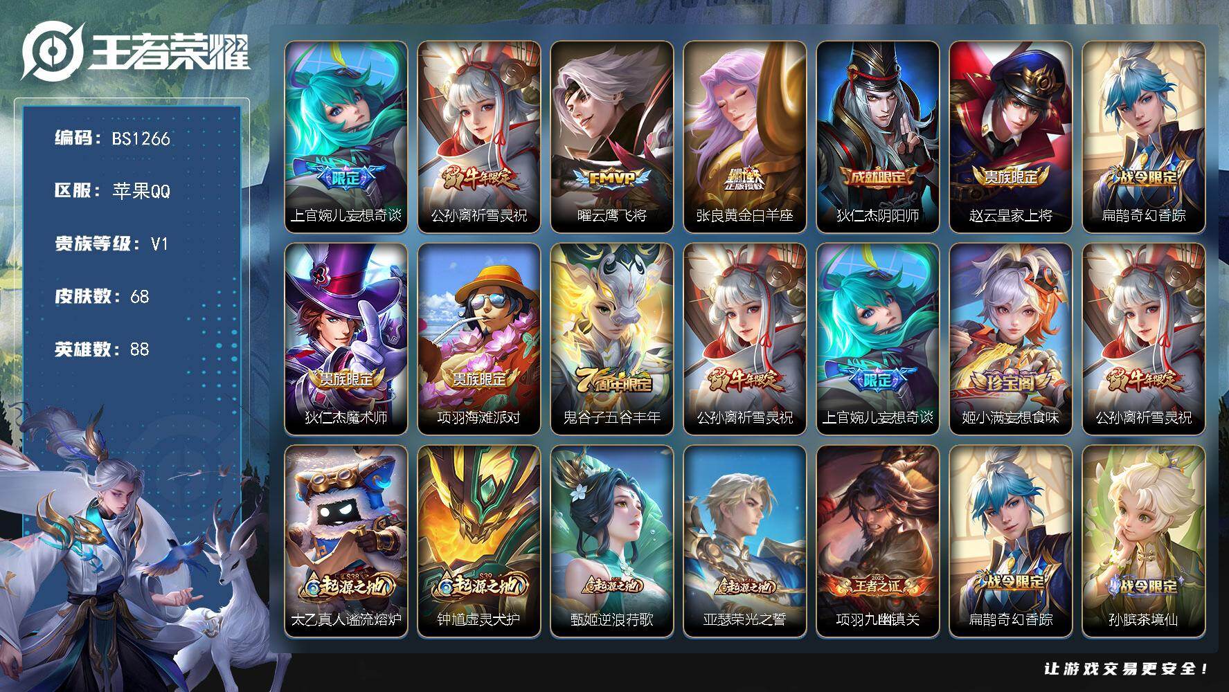 苹果Q-V1-永恒钻石I段位-88英雄-68皮肤-4传说-22史诗【英雄全皮