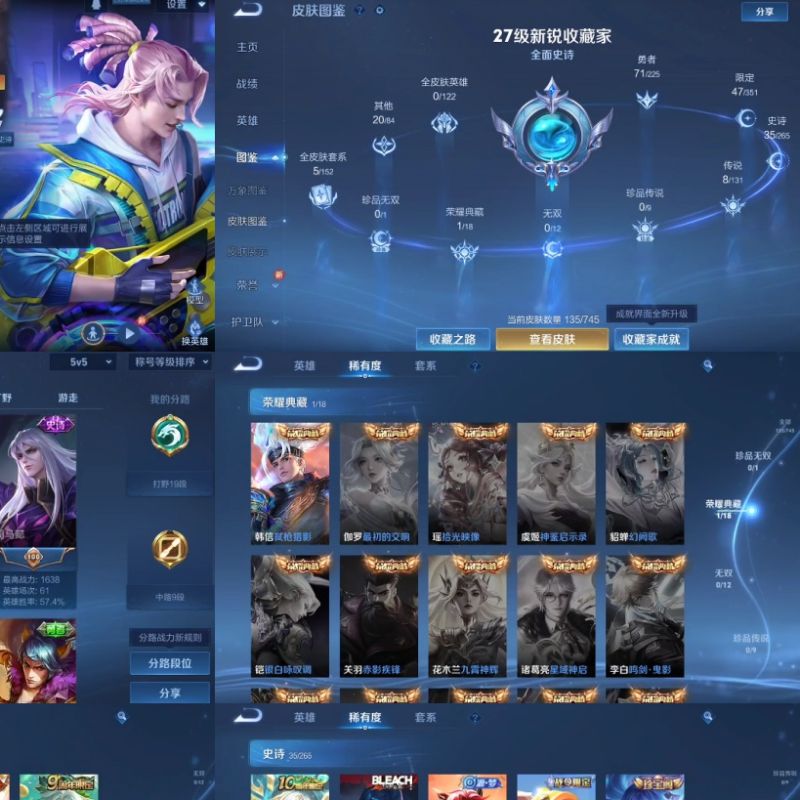 贵族6 荣耀典藏1 传说皮肤8 史诗皮肤35 皮肤数量135
