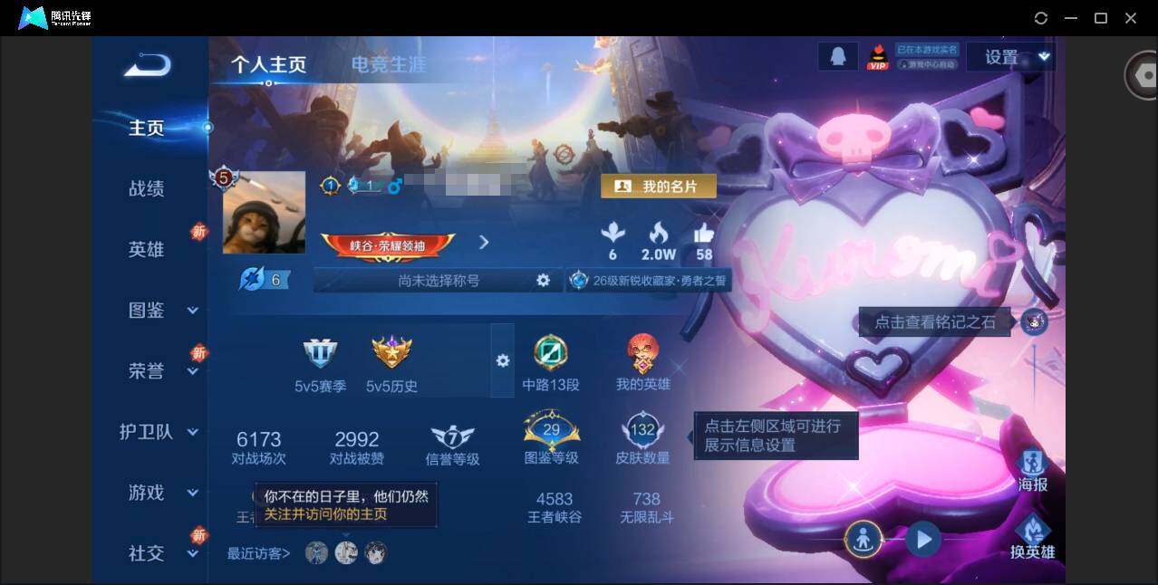 【贵族6 传说皮肤6 史诗皮肤49 皮肤数量183】当前段位:非凡王者 贵族积分:热门皮肤:神树通天 云鹰飞将 鸣野嵩 黄金狮子座 仲夏夜之梦 地狱之眼