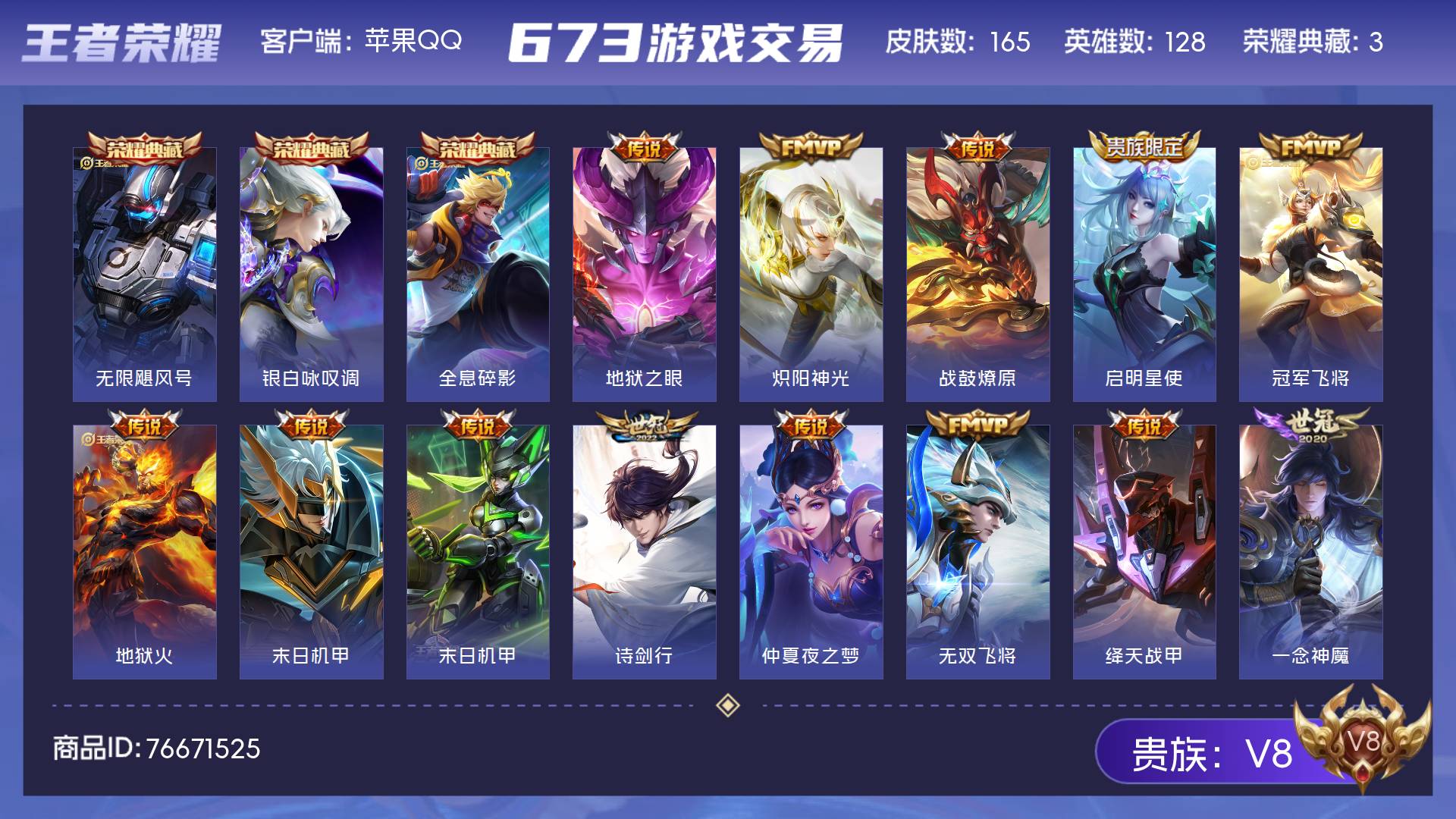 V8 皮肤165 英雄128 永恒钻石 荣耀典藏3 传说16