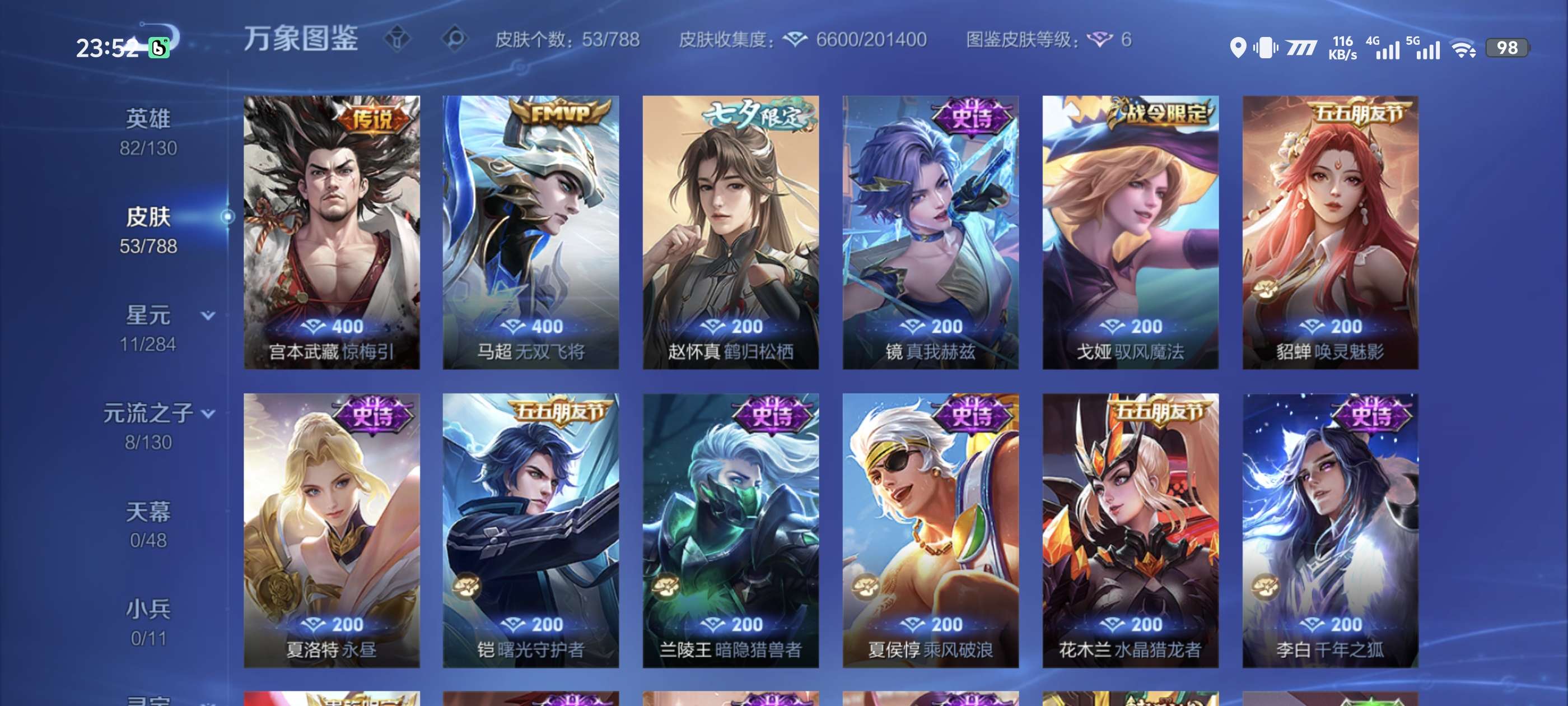 【16777233】贵族等级6/荣耀典藏数量1/传说皮肤数量6/史诗皮肤数量4