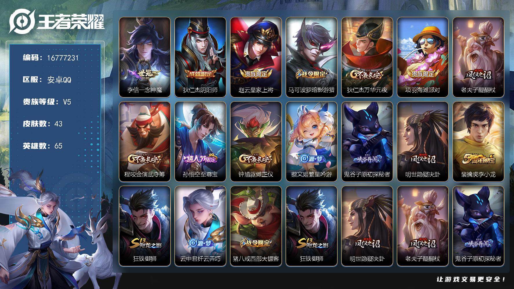 【16777231】贵族等级5/传说皮肤数量1/史诗皮肤数量10/皮肤数量43