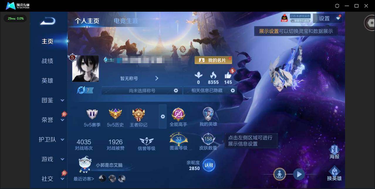 贵族等级: V4 英雄数: 119 皮肤数: 83 星传说: 幽冥之眼 传说皮