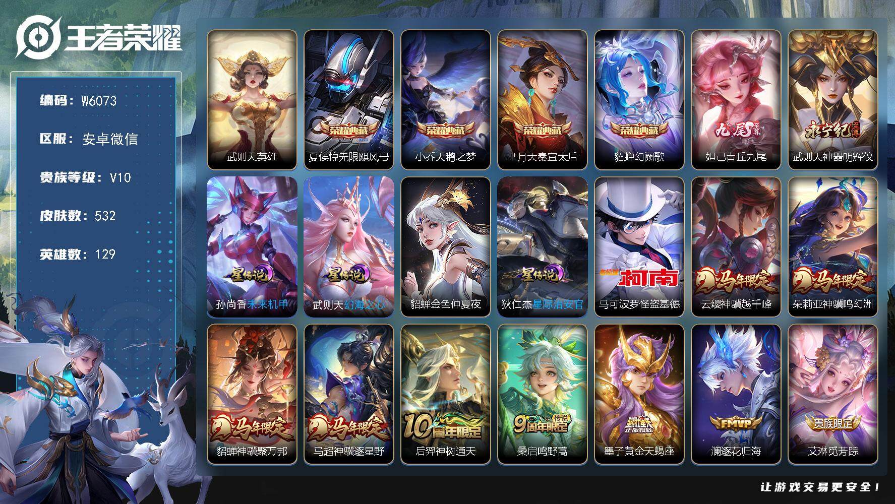 【W6073】安卓微信-可二次-贵10-129英雄-532皮肤-7典藏(1水晶