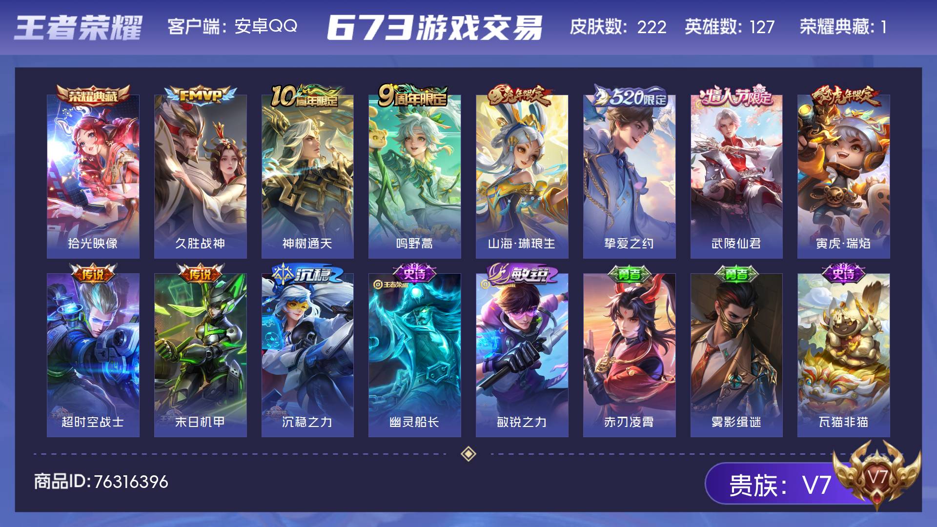 V7 皮肤222 英雄127 至尊星耀 荣耀典藏1 星传说2 传说9