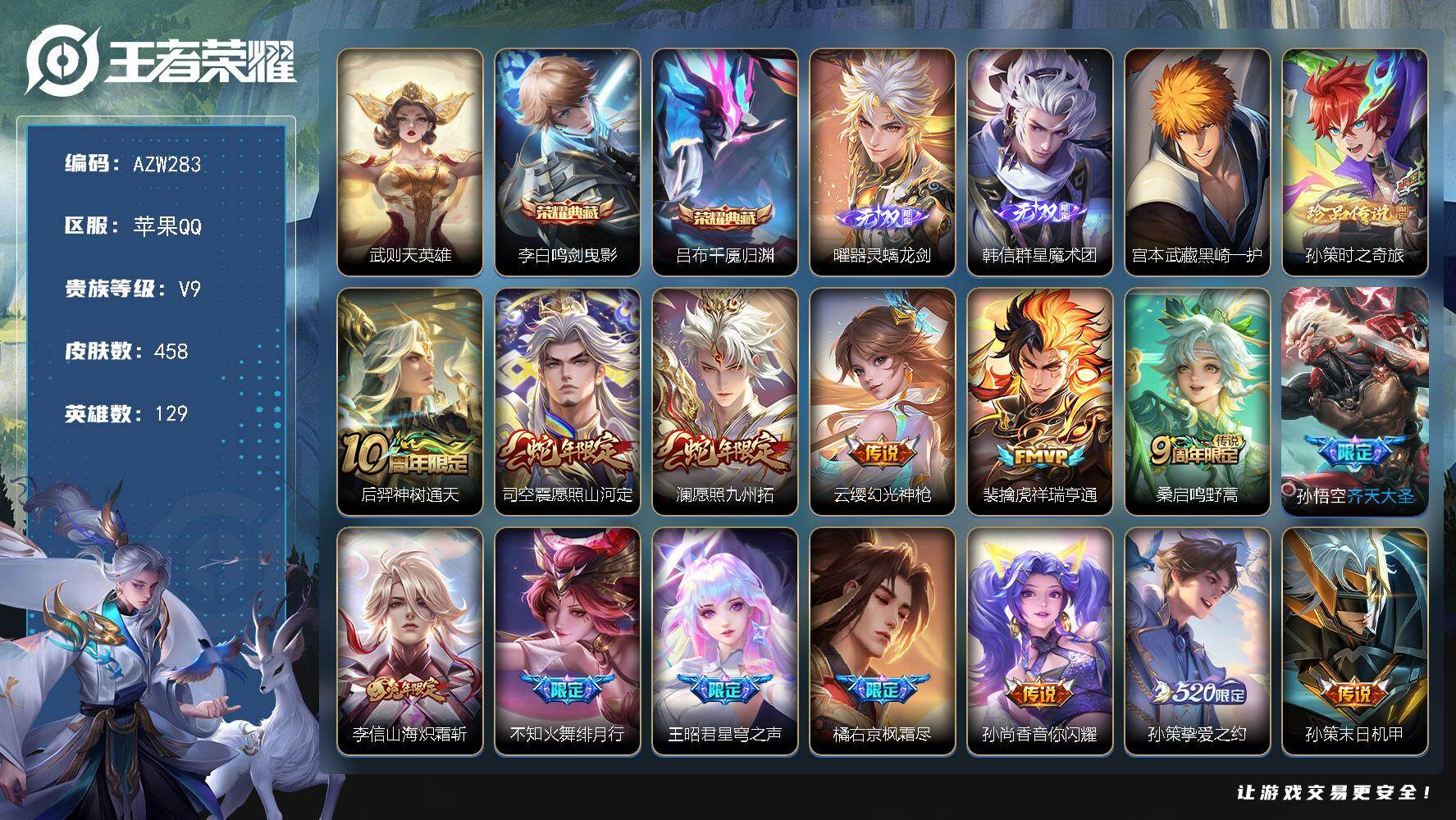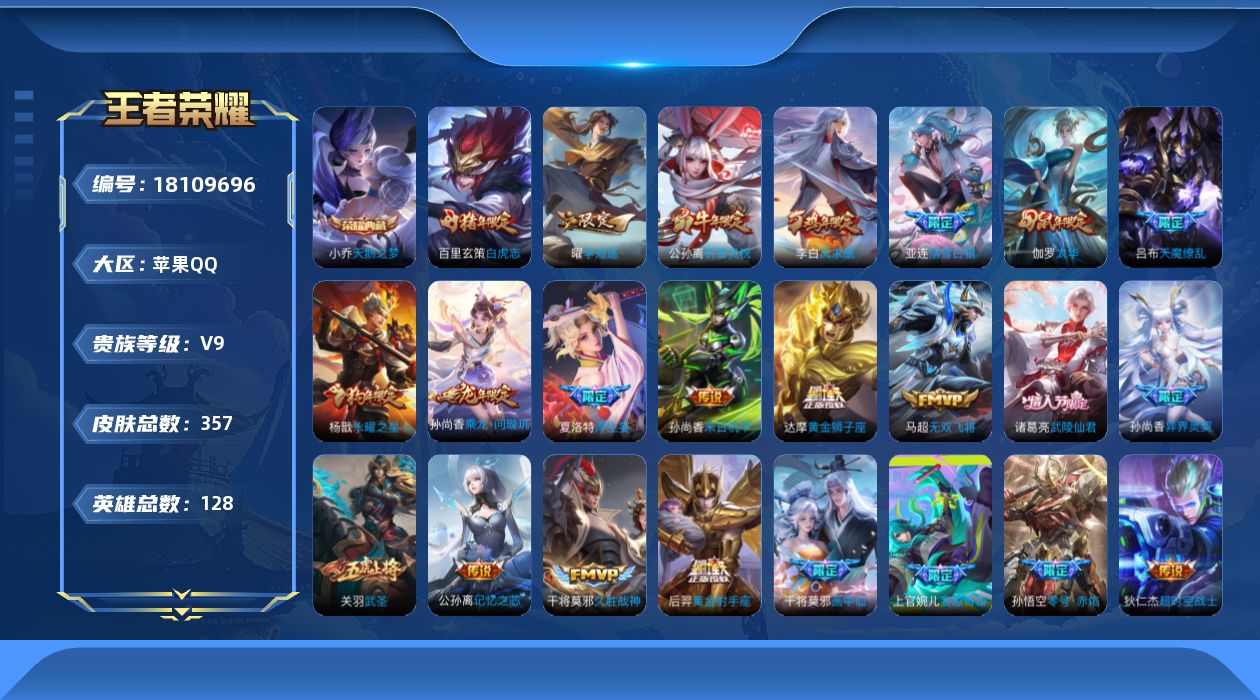【AZW283】苹果Q-V9-最强王者段位-129英雄-458皮肤-2典藏皮肤