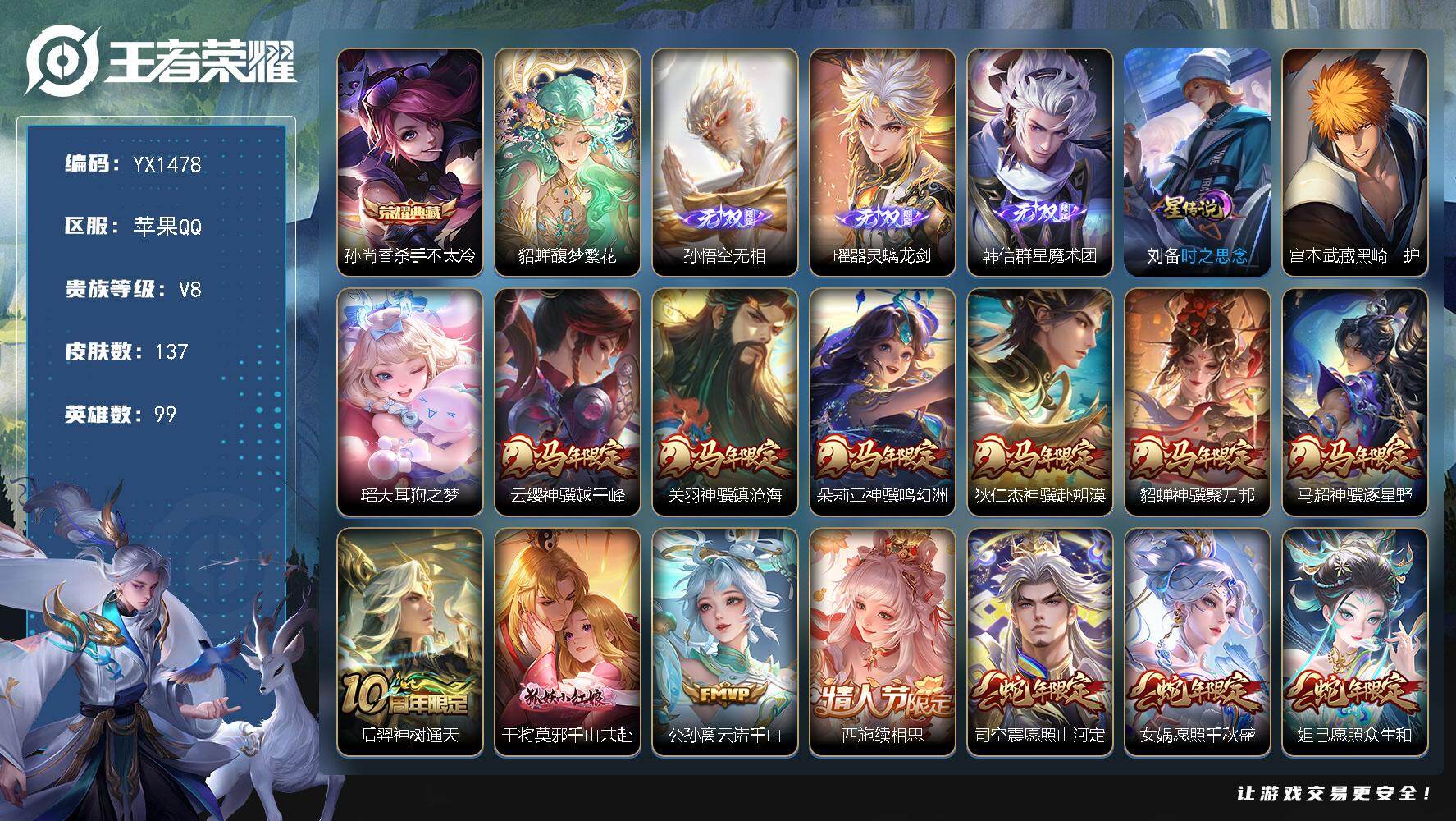 【mwz345】苹果Q-V7-最强王者段位-125英雄-206皮肤-1典藏皮肤