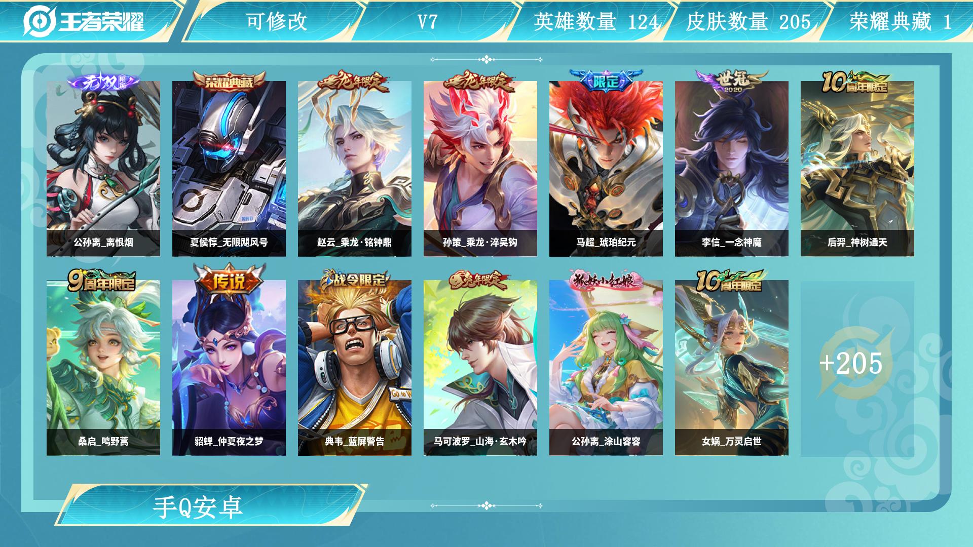 安卓Q-V8-最强王者段位-128英雄-340皮肤-2典藏皮肤-1无双-34传说