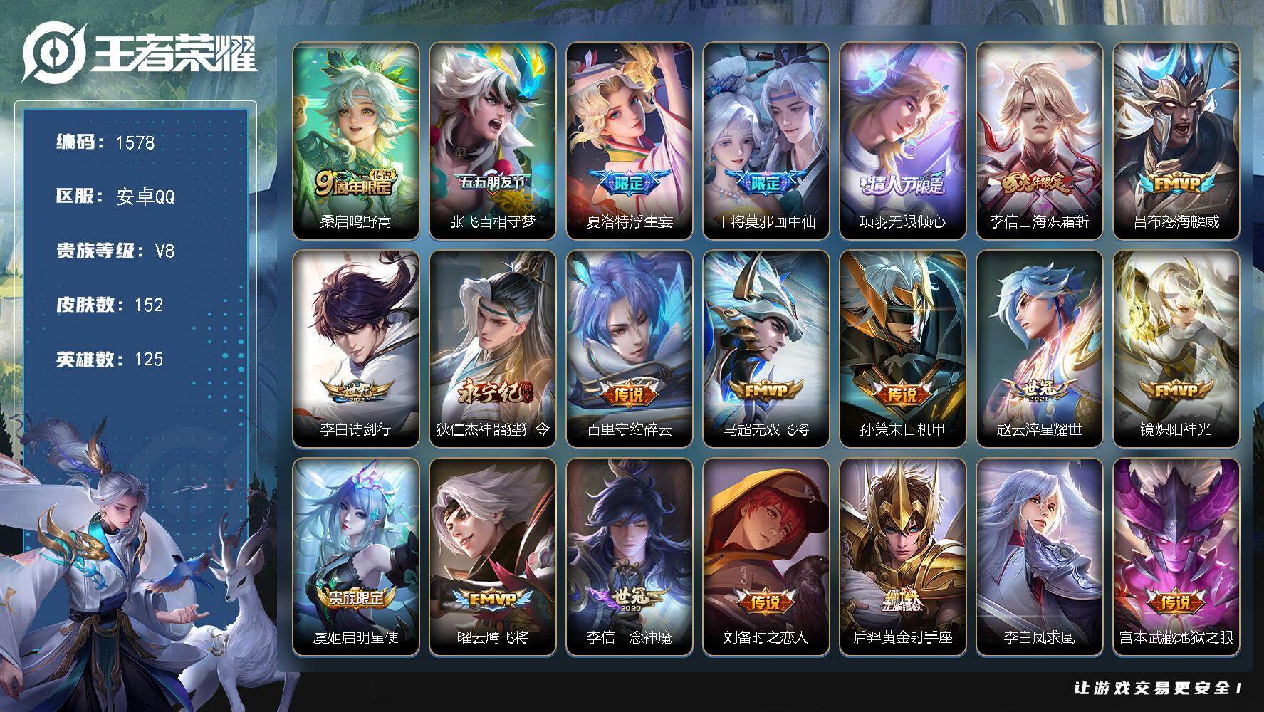 安卓Q-V8-永恒钻石II段位-125英雄-152皮肤-22传说-42史诗【英