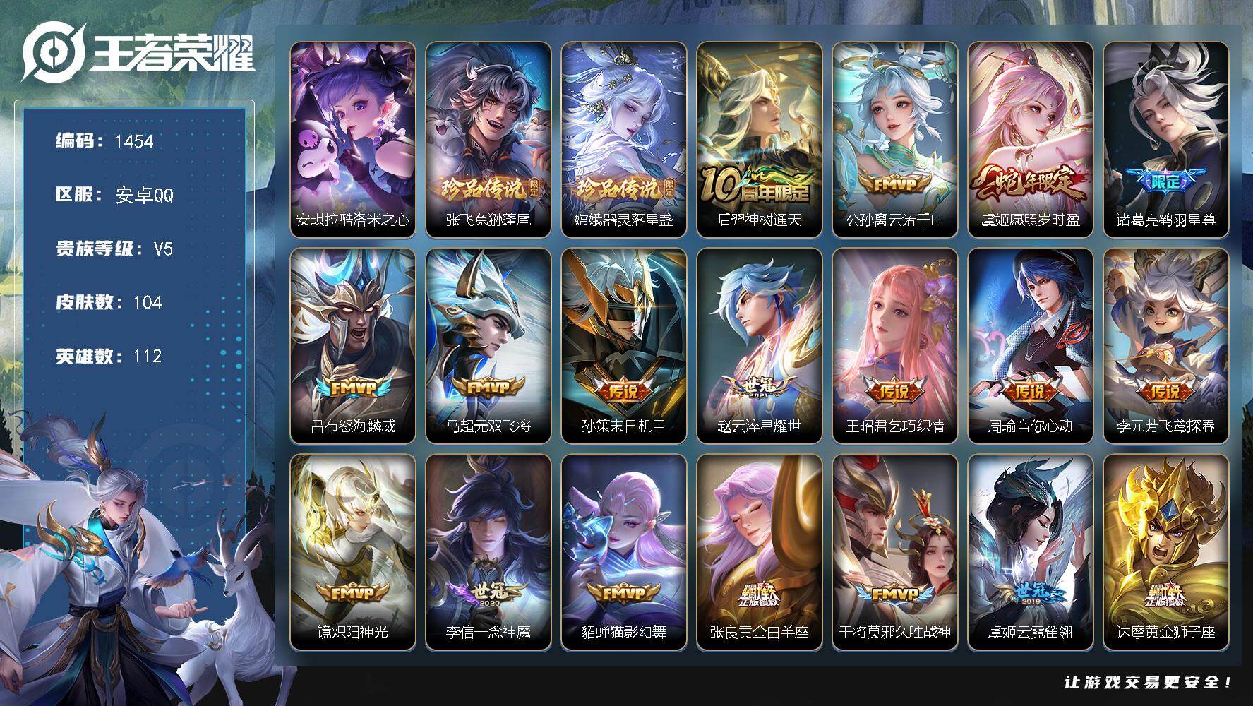 女号 安卓Q-V5-永恒钻石V段位-112英雄-104皮肤-3珍品传说-24传说