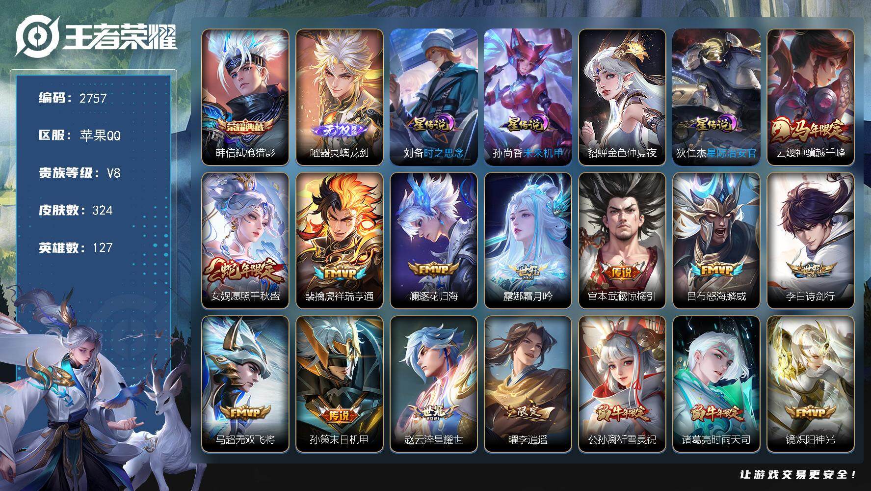 至尊宝,,白虎志,,1天幕,苹果Q-V8-最强王者段位-127英雄-324皮肤-