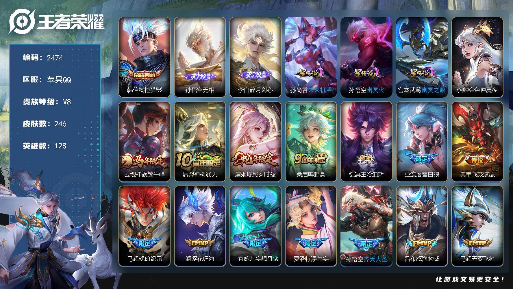 苹果Q-V7-永恒钻石II段位-127英雄-258皮肤-1典藏皮肤-1无双-2珍