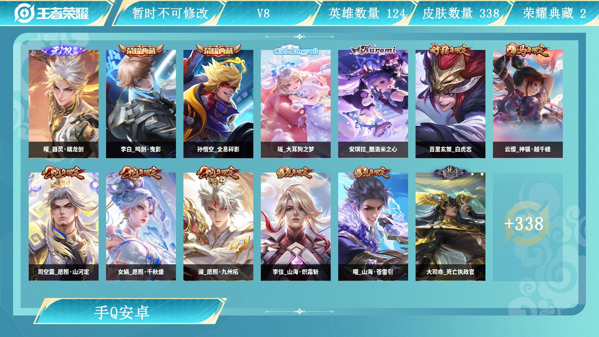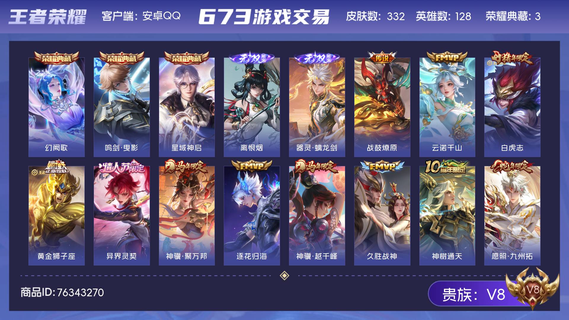 V8 皮肤332 英雄128 非凡王者 荣耀典藏3 无双皮肤2 星传说1 传说36