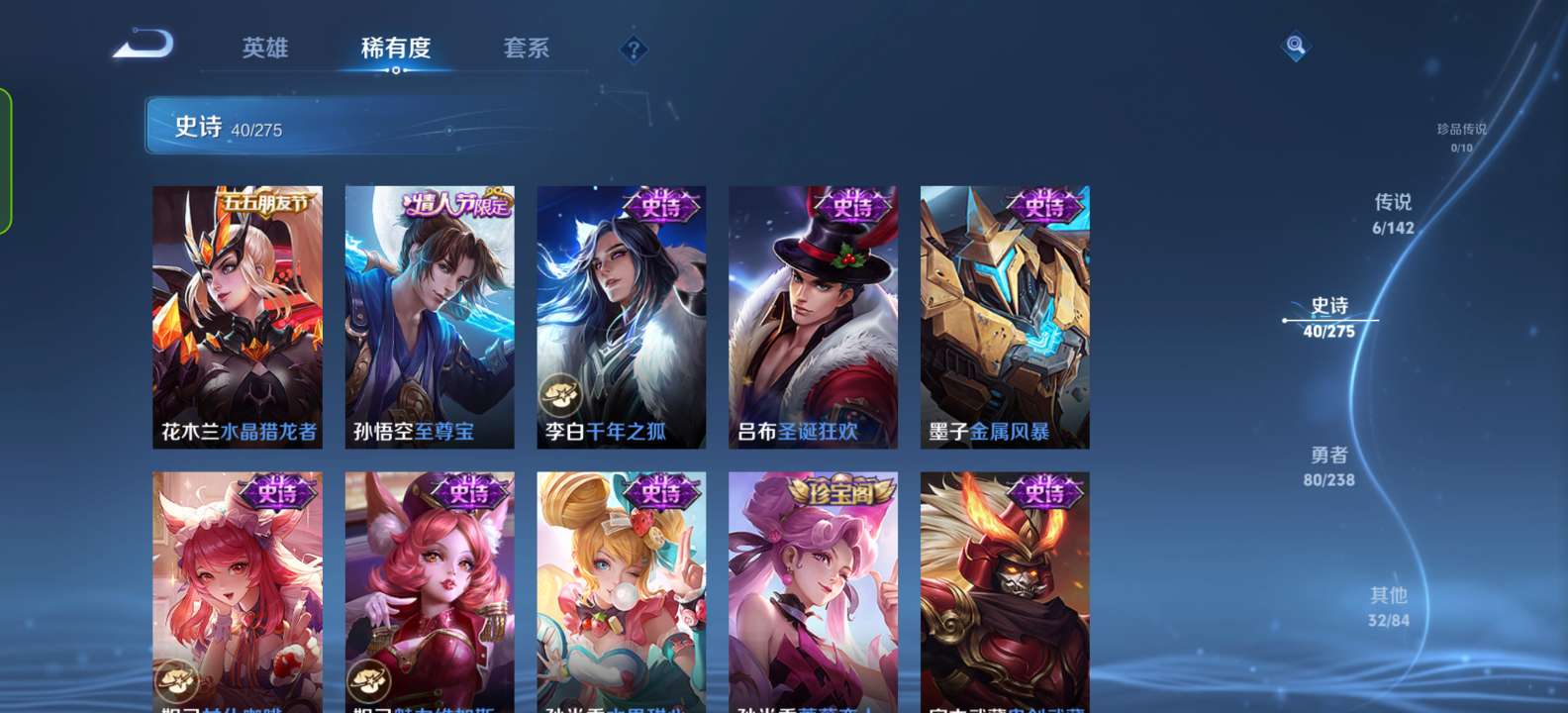 V10 皮肤561 英雄130 至尊星耀 荣耀典藏15 无双皮肤4 珍品传说1 星传说5 传说67