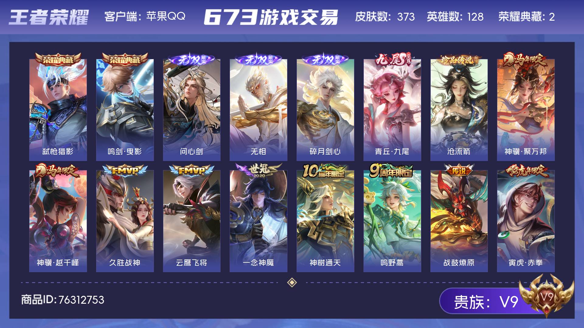 V9 皮肤373 英雄128 至圣王者 荣耀典藏2 无双皮肤4 珍品传说1 星传说5 传说31