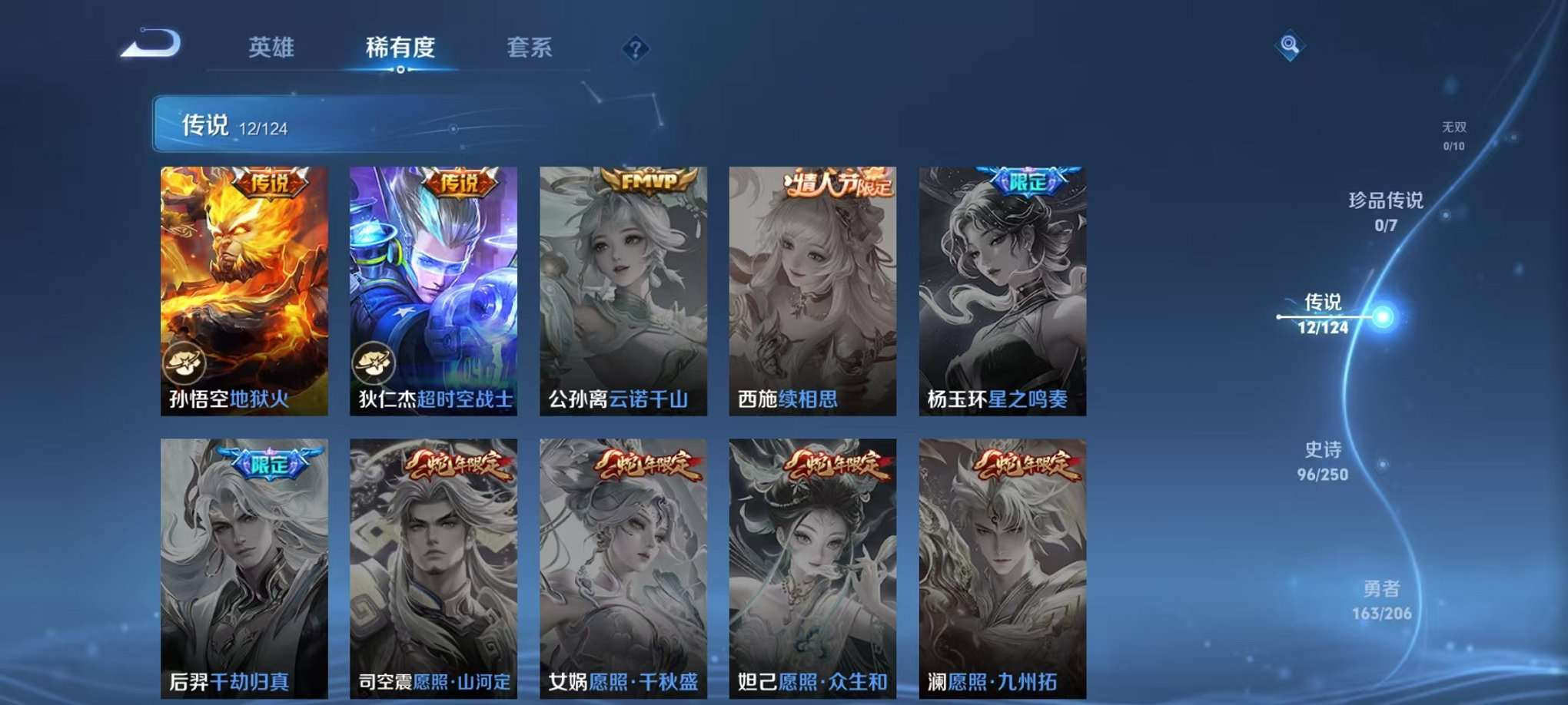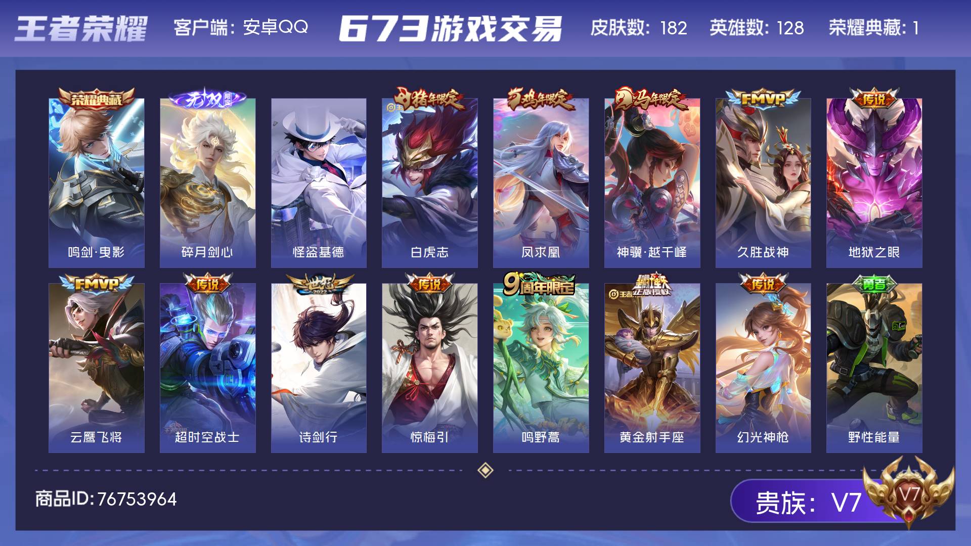 V7 皮肤182 英雄128 最强王者 荣耀典藏1 无双皮肤1 珍品传说1 星传说3 传说12