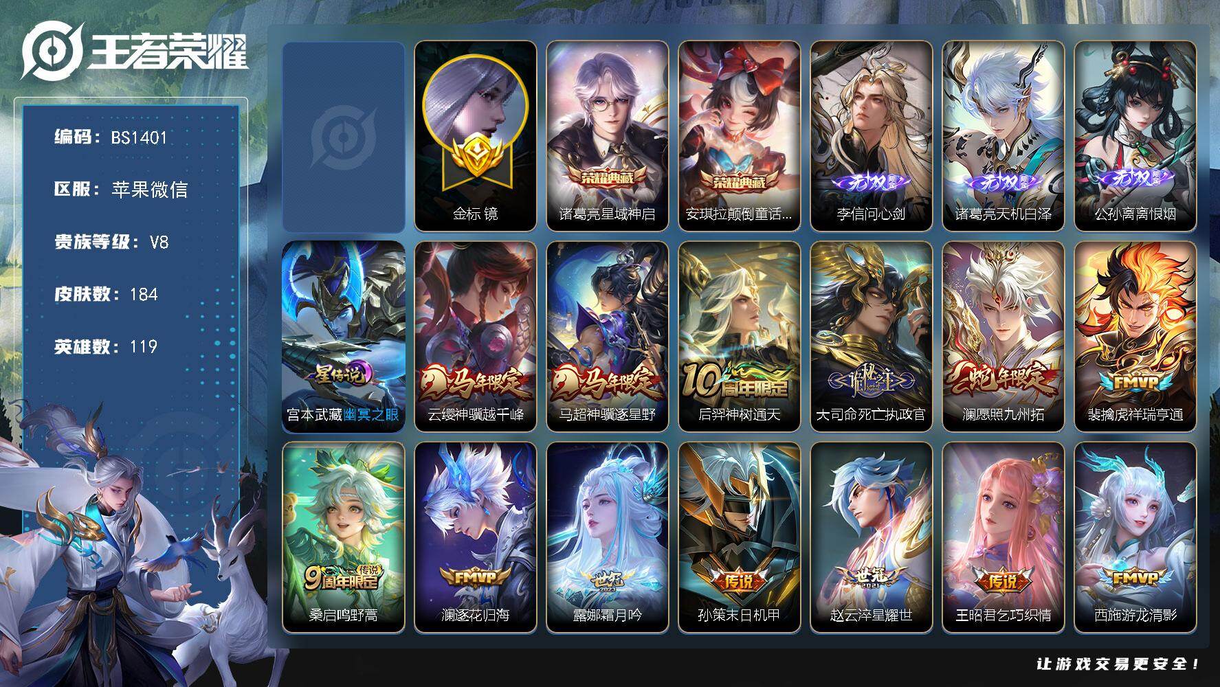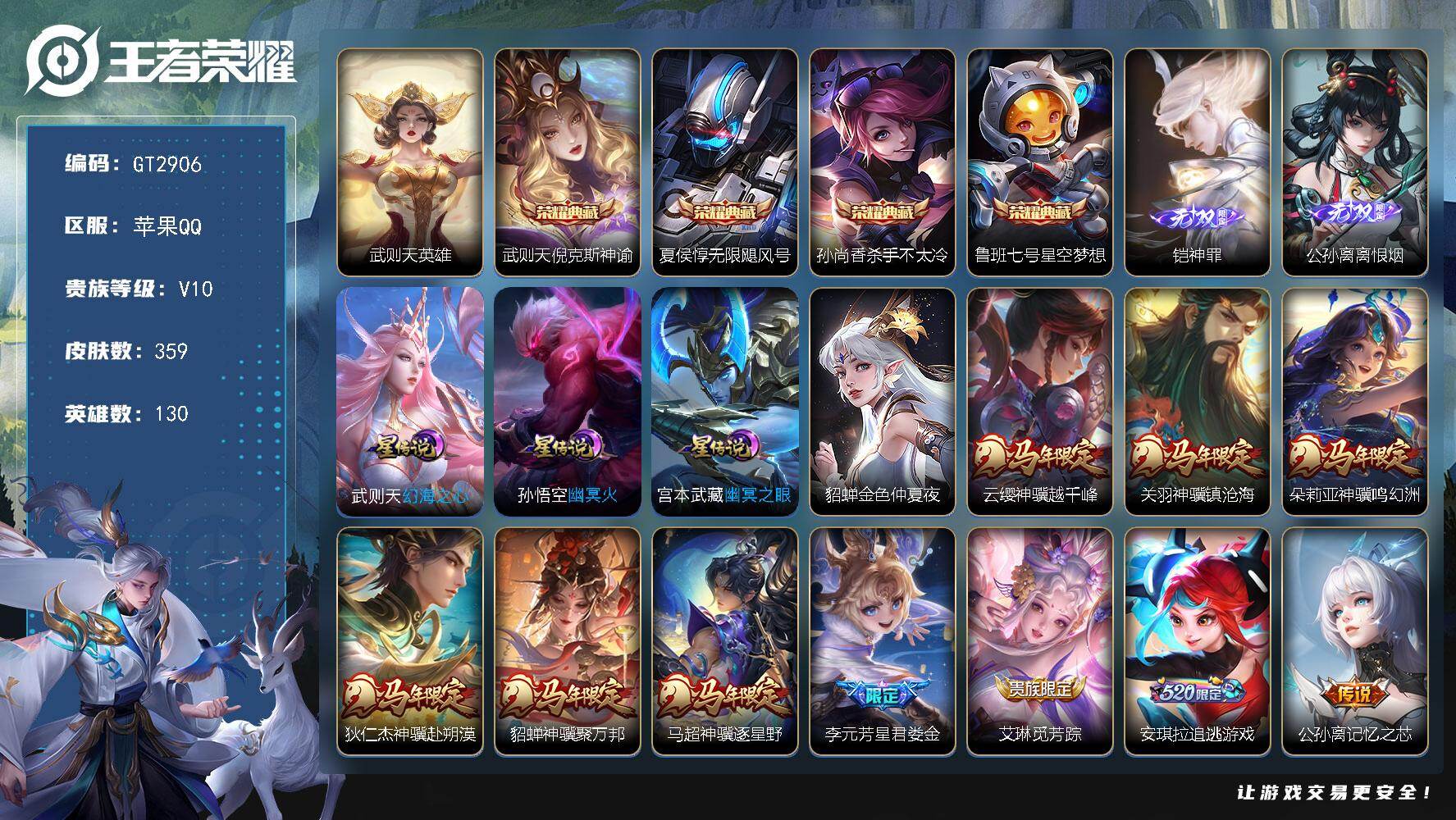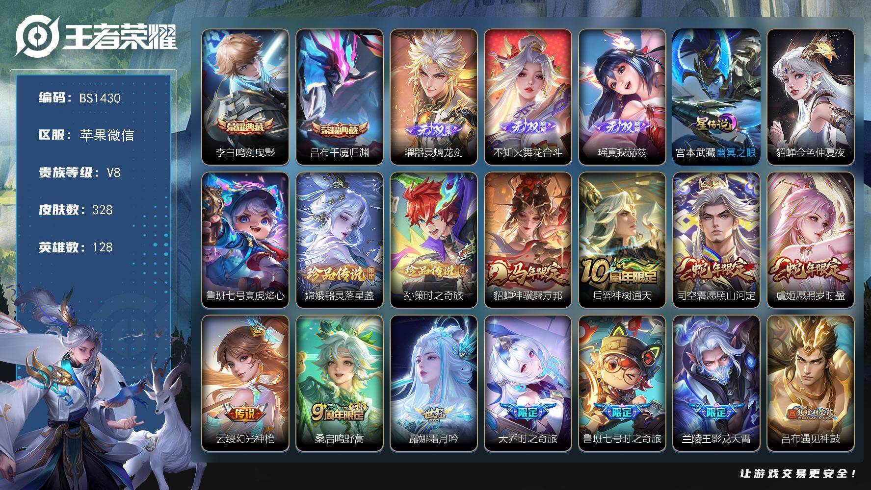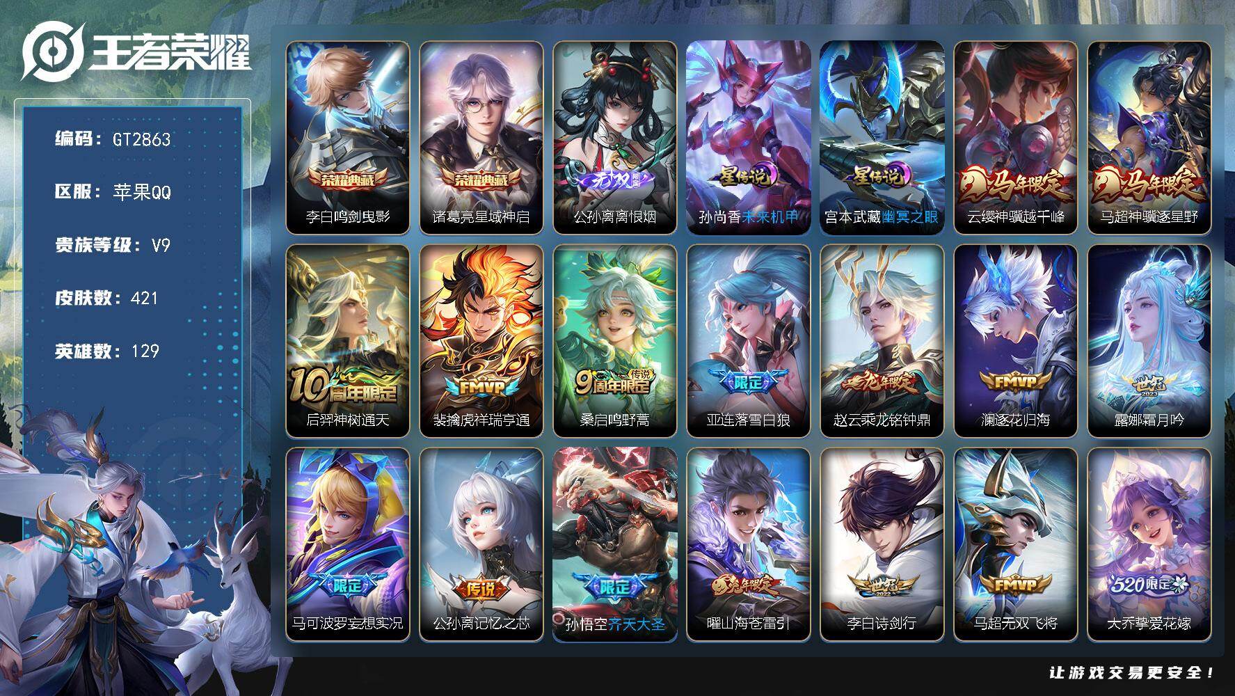可换绑【高质量v9号推荐·7打野无双皮·3典藏有武则天·多传说·蛇年全套·限定