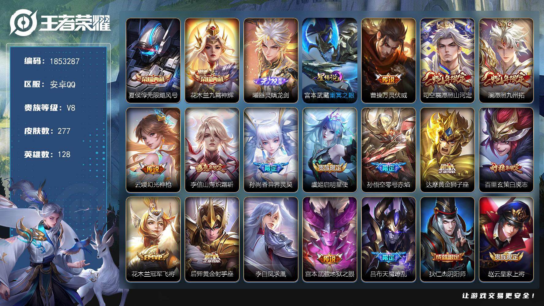 安卓WX-V8-至尊星耀IV段位-127英雄-238皮肤-1典藏皮肤-2无双-