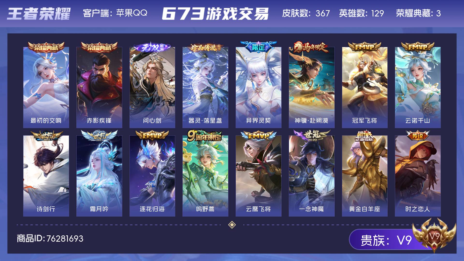 V9 皮肤367 英雄129 荣耀王者 荣耀典藏3 无双皮肤1 珍品传说1 传说35