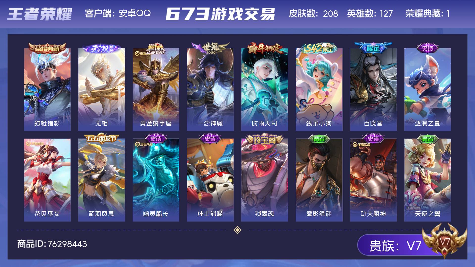 V7 皮肤208 英雄127 永恒钻石 荣耀典藏1 无双皮肤1 传说3