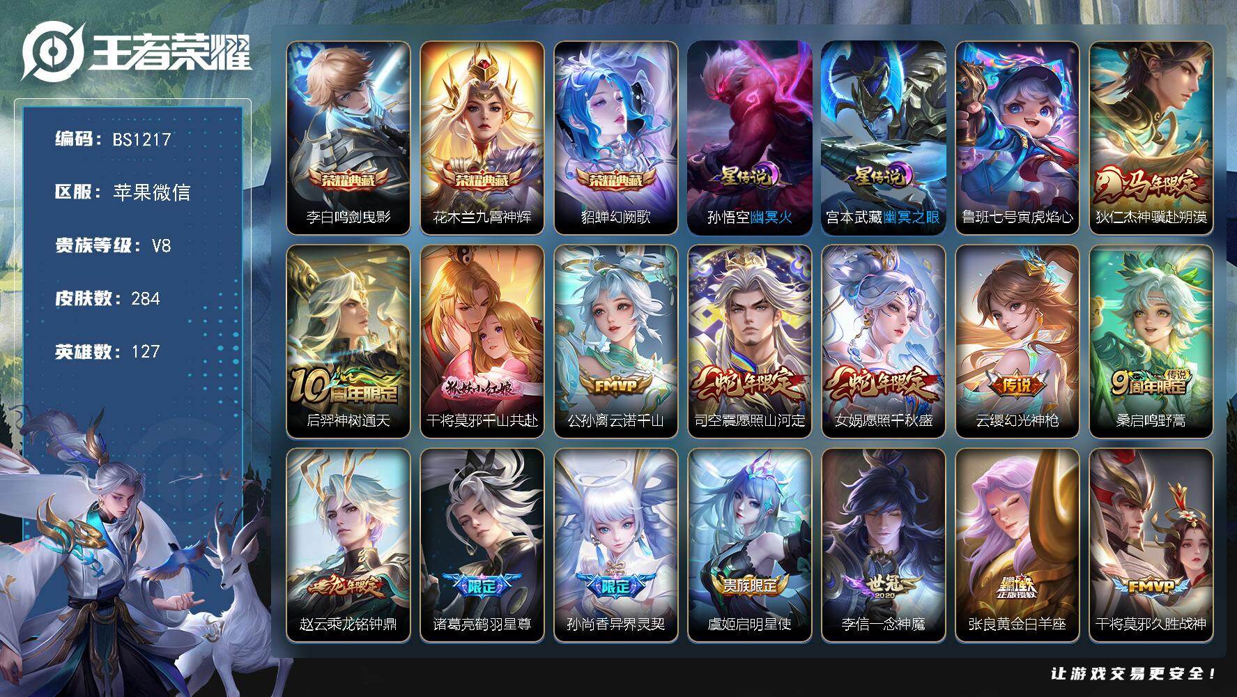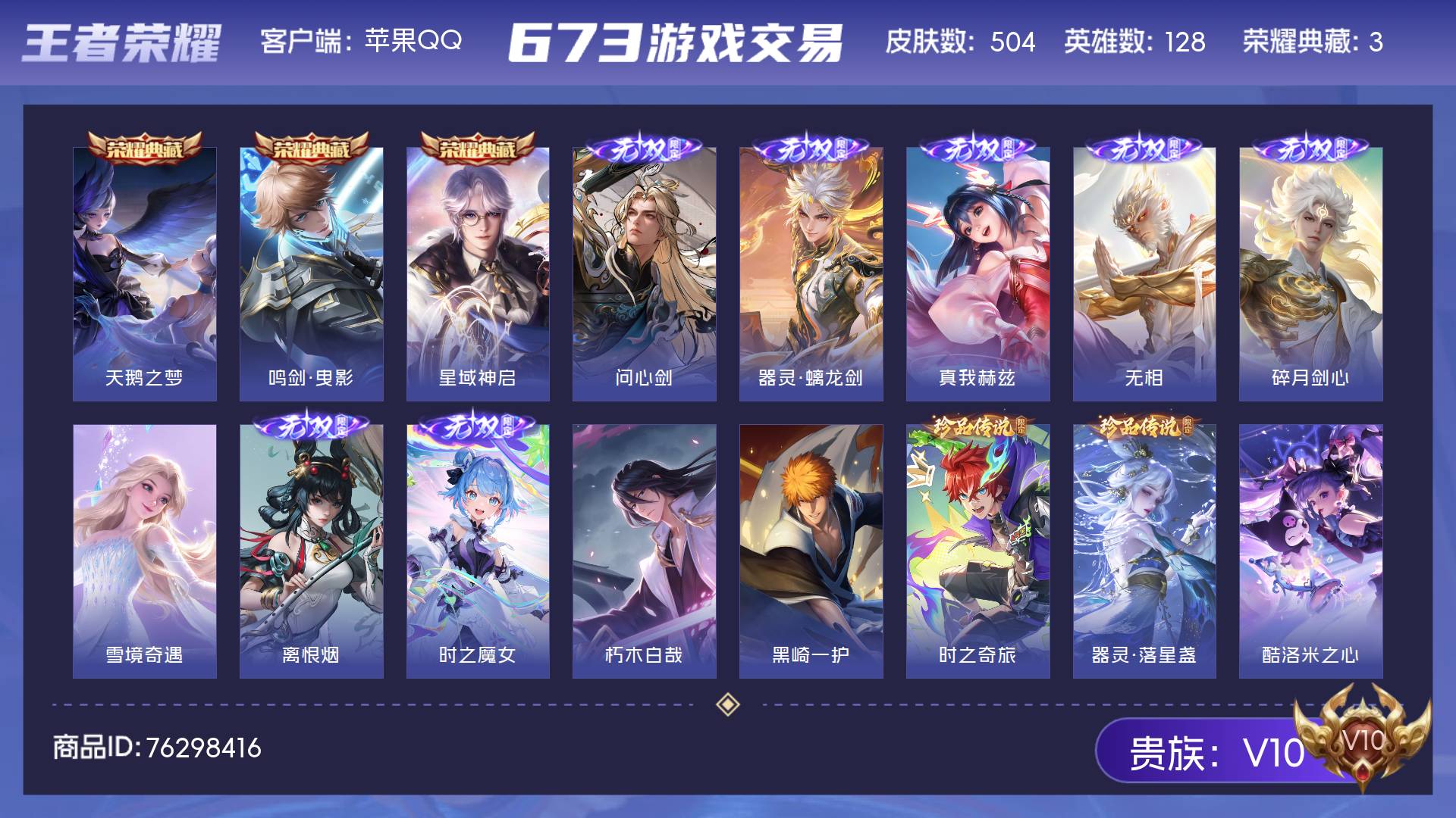 苹果Q-V9-最强王者段位-128英雄-450皮肤-3典藏皮肤-1无双-59传
