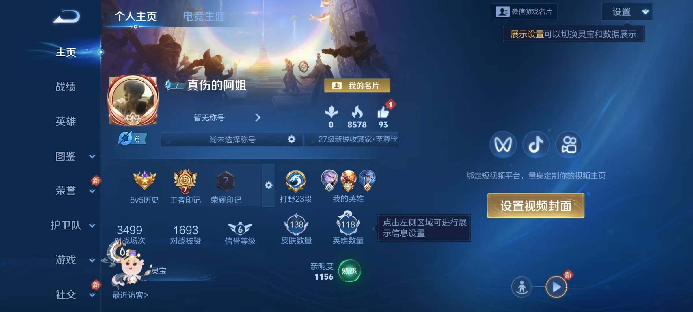 贵族等级: V7 英雄数: 118 皮肤数: 138 传说皮: 猫影幻舞,山海